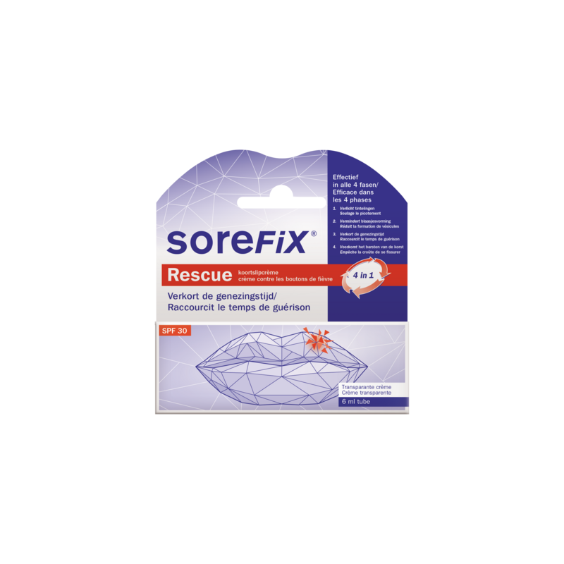 SoreFix Rescue koortslipcrème is een op zink gebaseerde crème die de duur van een koortslip kan verkorten. Daarnaast zorgt de transparante crème ervoor dat je er minder last van hebt. SoreFix Rescue is een transparante vette crème waardoor de koortslip niet extra wordt geaccentueerd.