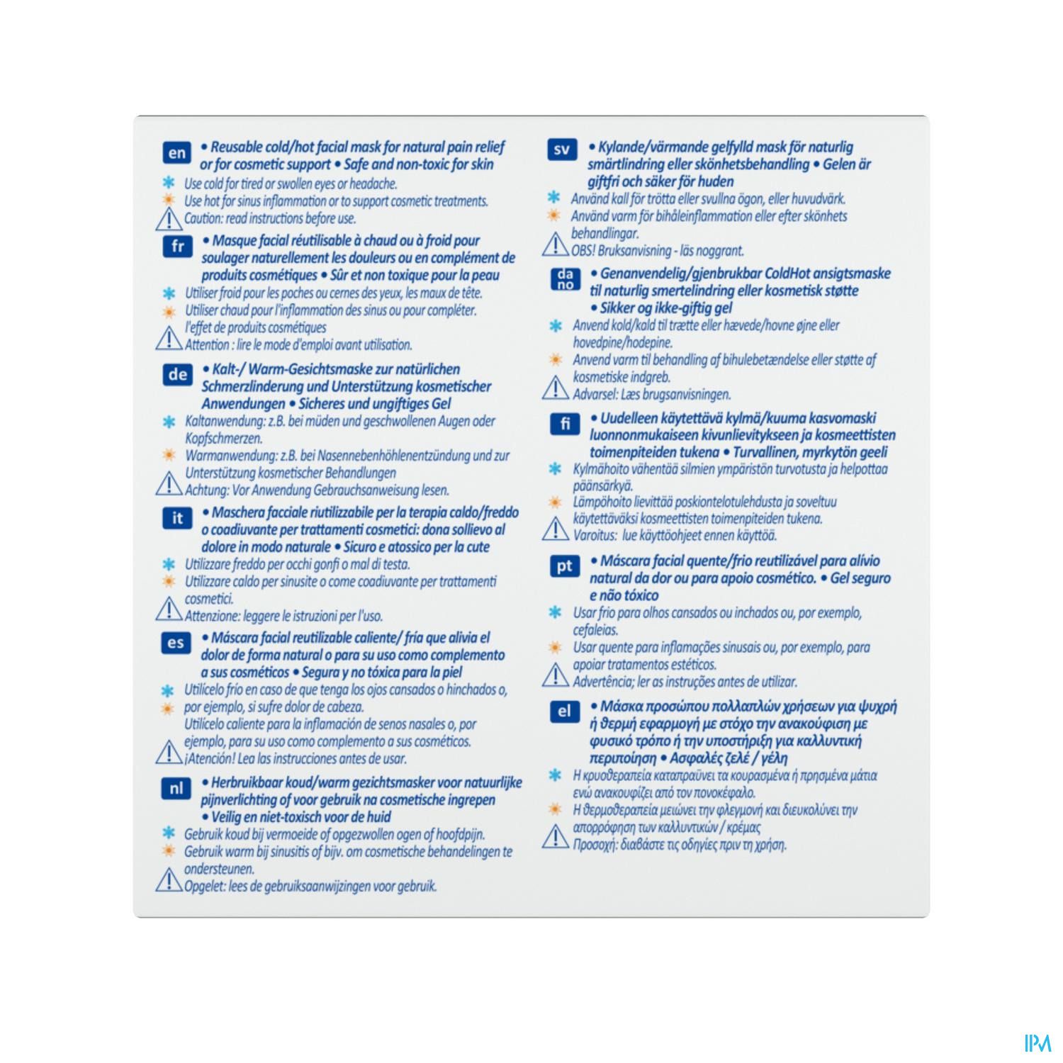 Een herbruikbaar masker met koude of warme gel voor natuurlijke pijnverlichting of ondersteuning bij cosmetische behandelingen. Koud gebruiken bij hoofdpijn en migraine, vermoeide en gezwollen ogen of koorts. Warm gebruiken bij een verkoudheid, griep, ontstoken sinussen of als ondersteuning bij cosmetische behandelingen. Dankzij de speciale fluweelzachte en huidvriendelijke laag is er geen extra bescherming nodig. Gemakkelijk klaar te maken voor gebruik (in de magnetron of koelkast)