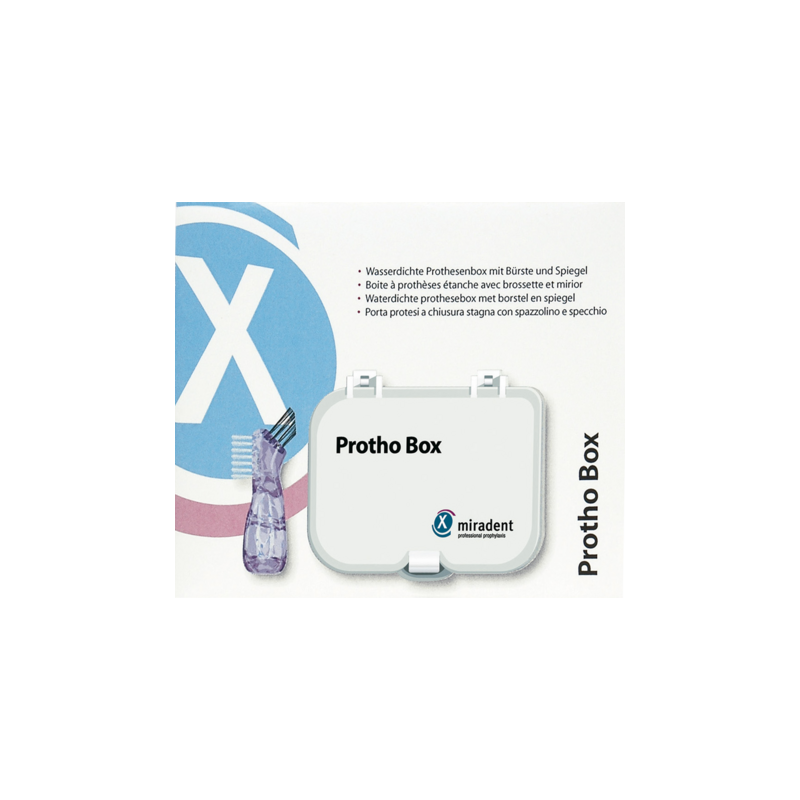 De Protho Box van Miradent is een handig opbergdoosje van stevig plastic voor je kunstgebit of beugel, voorzien van een ergonomische mini-protheseborstel. Het praktische is dat de box volledig waterdicht is. Daardoor kan het kunstgebit of beugel in een reinigingsvloeistof worden bewaard, zonder lekken. Hierbij vind je een ergonomisch gevormde mini-protheseborstel (ook los verkrijgbaar). Met de witte borstel kan de buitenkant van de prothese worden schoongemaakt en met de zwarte borstel kan de binnenkant worden gereinigd.