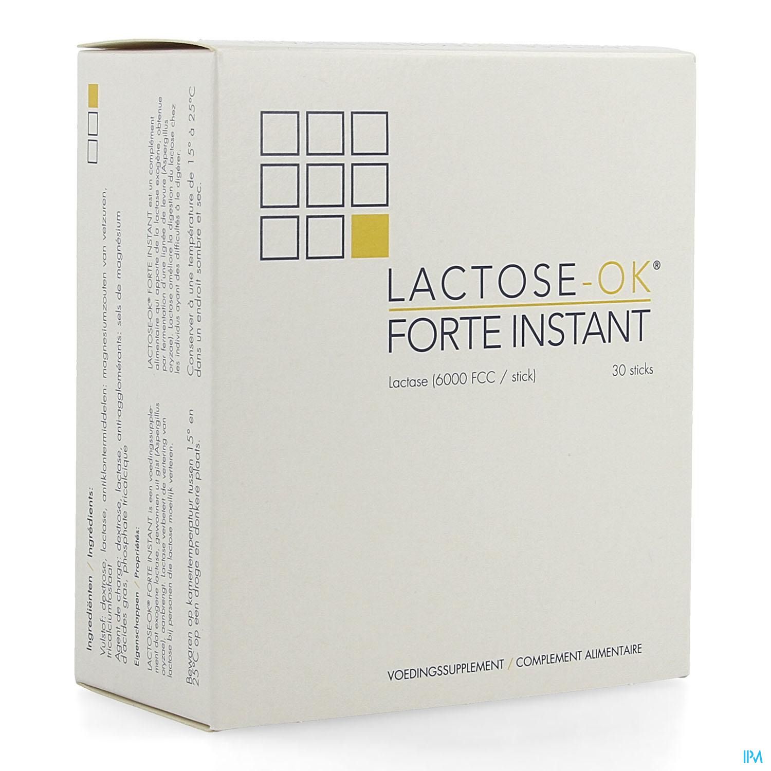LACTOSE-OK® FORTE INSTANT is een voedingssupplement, onder de vorm van sticks, dat exogene lactase aanbrengt, een enzym gewonnen uit Aspergillus oryzae.