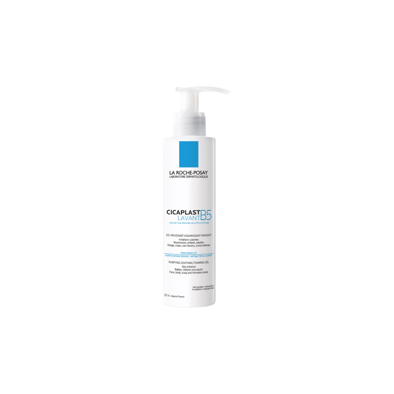 La Roche-Posay's Cicaplast Wasgel B5 is een kalmerende, schuimende reinigingsgel om een geïrriteerde of broze huid te reinigen zonder haar uit te drogen. Deze wasgel is geschikt voor het hele gezin. Voor gezicht, lichaam, intieme delen en hoofdhuid. Prikt niet in de ogen of wonden.