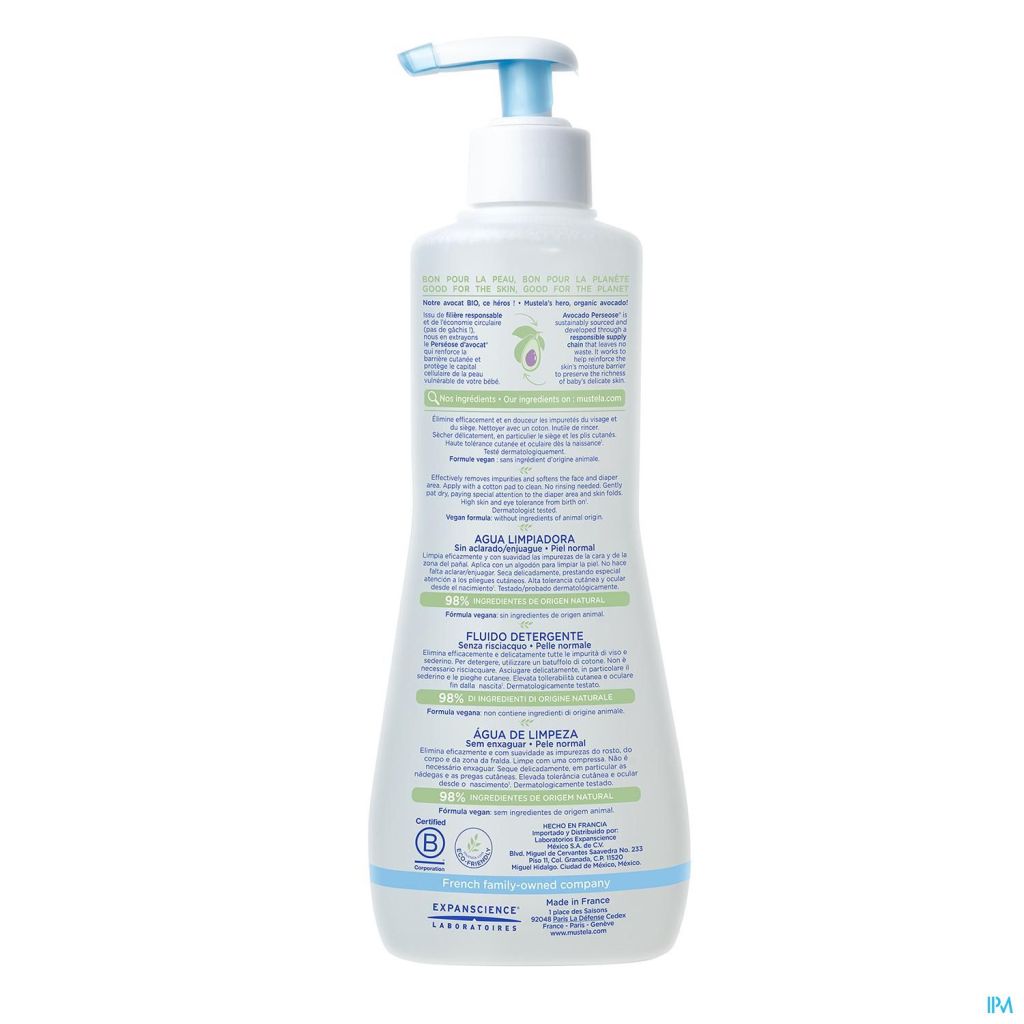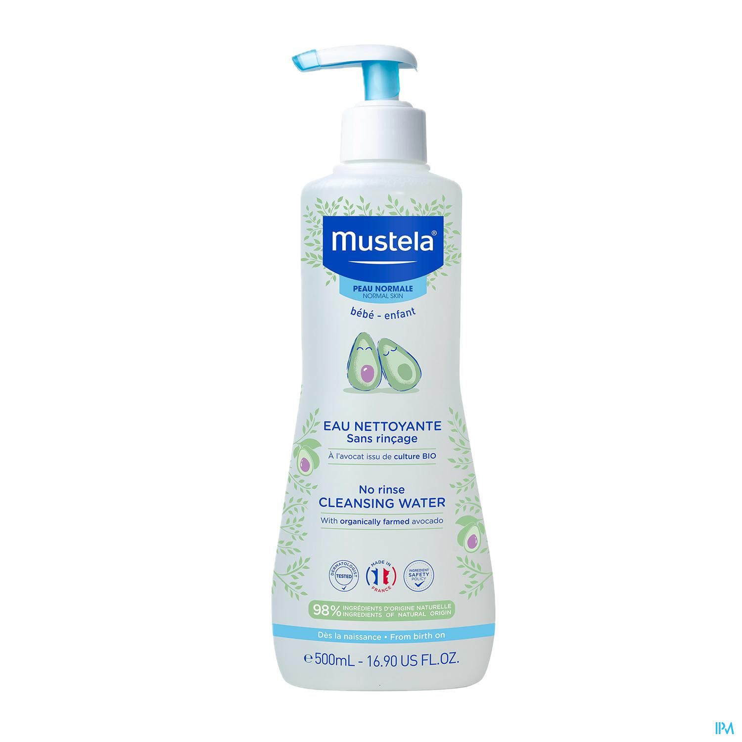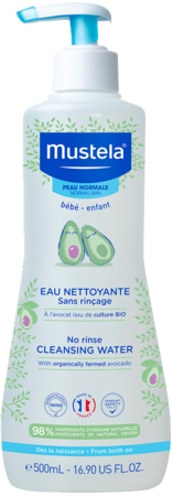 Het Reinigend Water bevat 98% ingrediënten van natuurlijke oorsprong, de overige 2% worden gebruikt om een aangename textuur te verkrijgen en om de bescherming van de formule op lange termijn te verzekeren. Mustela Reinigingswater laat de huid uniek en zacht ruiken en plakt niet.
