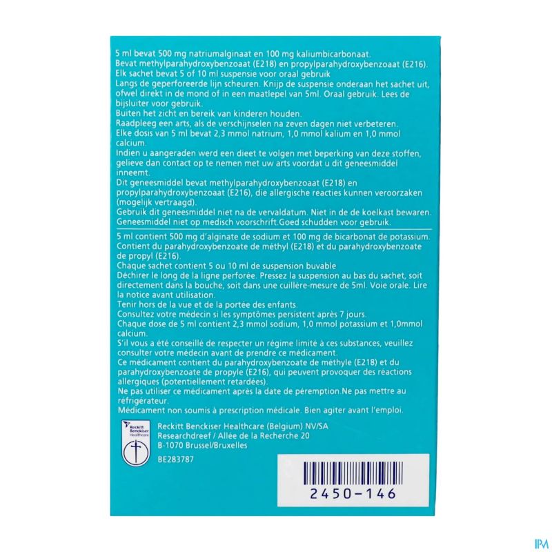 De werkzame stoffen in dit middel zijn 500 mg natriumalginaat en 100 mg kaliumbicarbonaat per 5 ml suspensie voor oraal gebruik. De andere stoffen in dit middel zijn calciumcarbonaat, carbomeer, methylparahydroxybenzoaat (E218), propylparahydroxybenzoaat (E216), natriumsaccharinaat, pepermuntaroma en gezuiverd water.