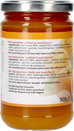 Ingrediënten: Abrikozen 50%, zoetstoffen: maltitol, acesulfaam-K, water, geleermiddel: pectine, voedingszuur: citroenzuur, bewaarmiddel: kaliumsorbaat.
