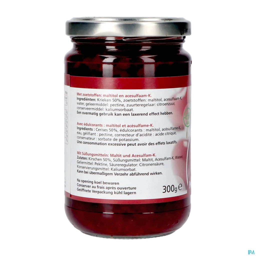 Ingrediënten: Krieken 50%, zoetstoffen: maltitol, acesulfaam-K, water, geleermiddel: pectine, voedingszuur: citroenzuur, bewaarmiddel: kaliumsorbaat.