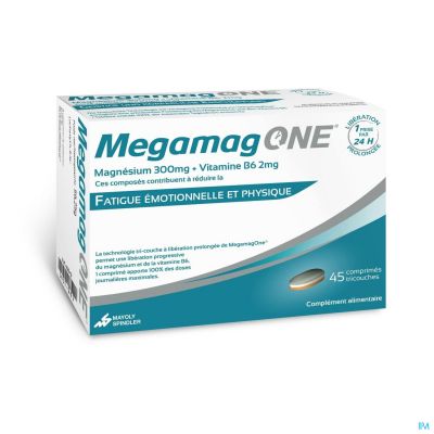 Met één inname van MegamagOne krijgt u een hele dag voldoende magnesium et vitamine B6. Door de drielagige technologie met vertraagde afgifte van MegamagOne kunnen magnesium en vitamine B6 langdurig afgegeven worden om beter tegemoet te komen aan de noden van het menselijk lichaam.