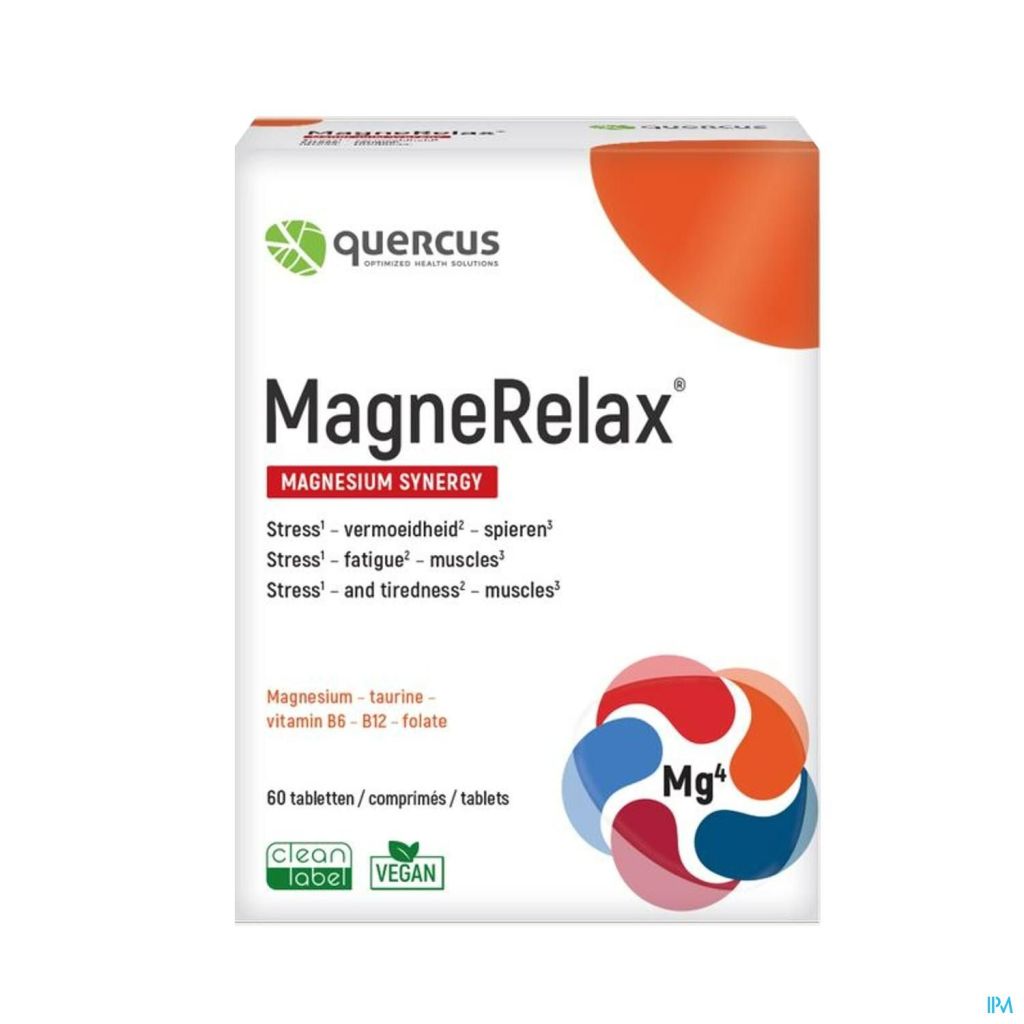Quercus MagneRelax® bevat magnesium uit 4 bronnen. Hierdoor wordt magnesium in 4 fasen opgenomen ter hoogte van het maag-darmkanaal. Magnesiumbisglycinaat, magnesiumglycerofosfaat, een gepatenteerd magnesiumacetyltaurinaat (ATA Mg®) en magnesium uit zeewater, dat heel complex is qua samenstelling (Aquamin®Mg). Magnesium ondersteunt de goede werking van het zenuwstelsel, het energieleverend metabolisme en de spierwerking. Daarnaast is MagneRelax® aangevuld met vitamine B6, B9 (folaat) en B12. Om een optimale opname van B-vitamines te verzekeren, wordt enkel gebruik gemaakt van actieve vormen. Deze zijn direct bruikbaar voor werking in het lichaam, zonder enige metabolisatie. Zo bevat dit complex Quatrefolic® i.p.v. foliumzuur, een 4e generatie folaatvorm (5-MTHF), dat de psychologische functies ondersteunt zoals stressbestendigheid. Vitamine B6 en B12 (MecobalActive®, een zeer zuivere vorm van methylcobalamine) dragen bij tot de vermindering van vermoeidheid.