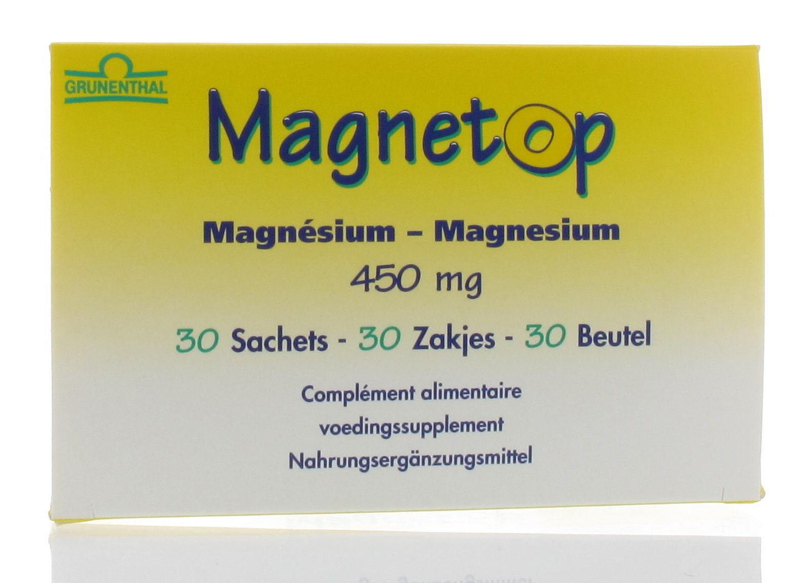 Een zakje Magnetop bevat 450mg magnesium = 120,0% ADH