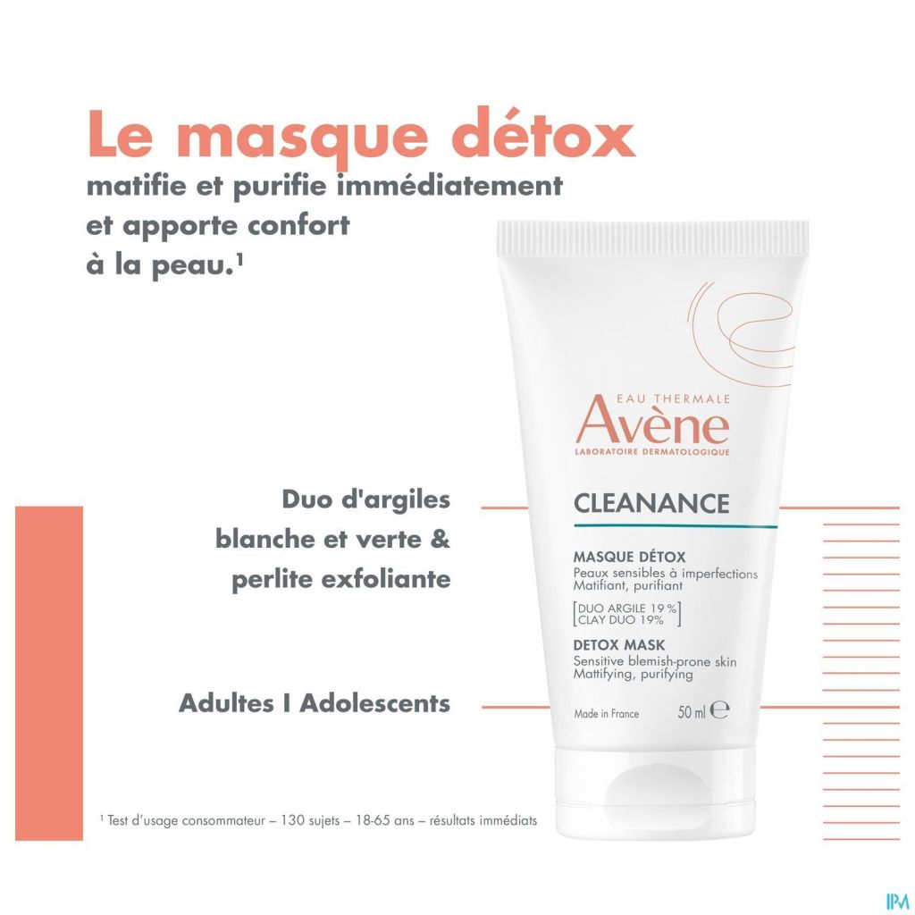 CLEANANCE Detoxmasker is het compromisloze masker voor de huid die gevoelig is voor onzuiverheden. Dankzij een exclusieve combinatie van geconcentreerde absorberende klei (19%) en exfoliërend perliet zuivert, matteert en vernauwt het de poriën in slechts 5 minuten*. Dankzij de hydraterende en voedende bestanddelen en het Thermale Water van Avène voelt de huid fijn en gekalmeerd aan. Bij 90% van de gebruikers worden onvolmaaktheden minder uitgesproken**.