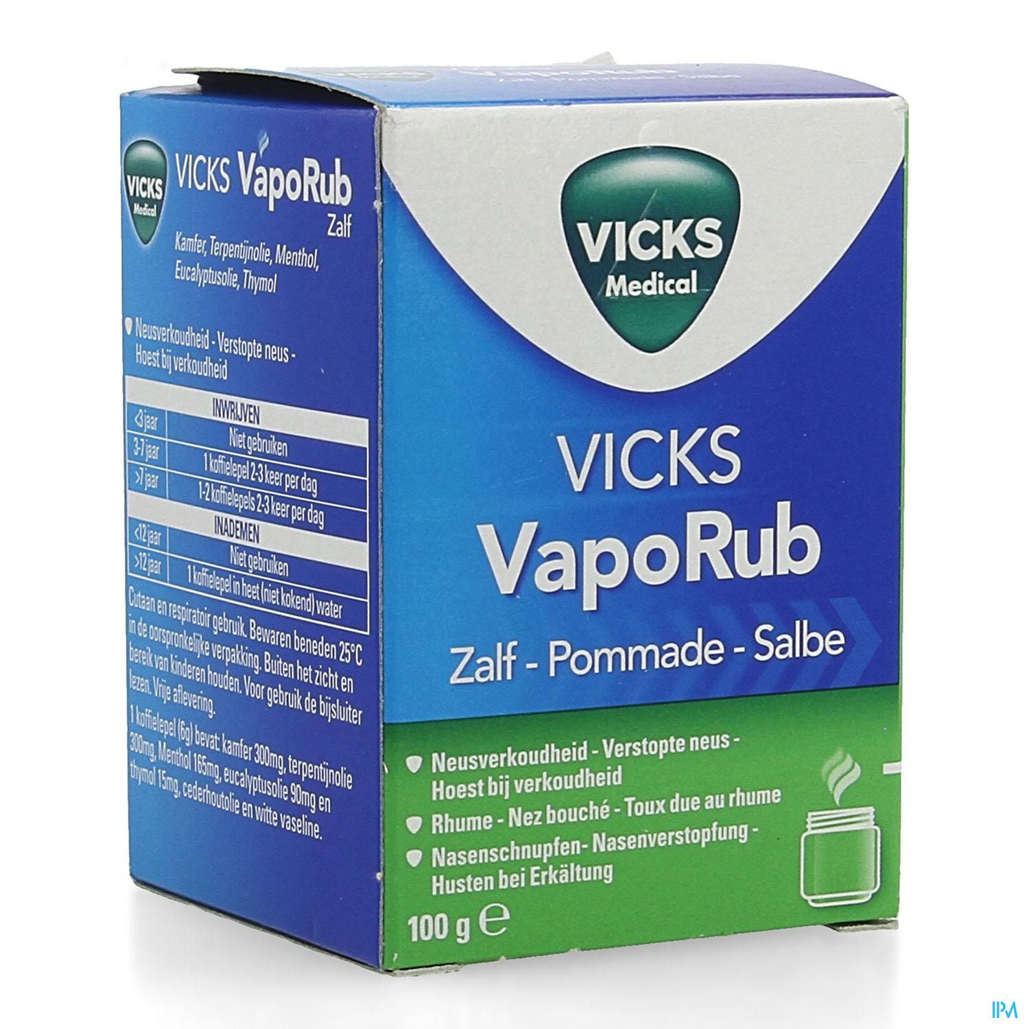 Vicks Vaporub Zalf 100g is een geneesmiddel : Lees de bijsluiter zorgvuldig. Niet langdurig gebruiken zonder medisch advies.