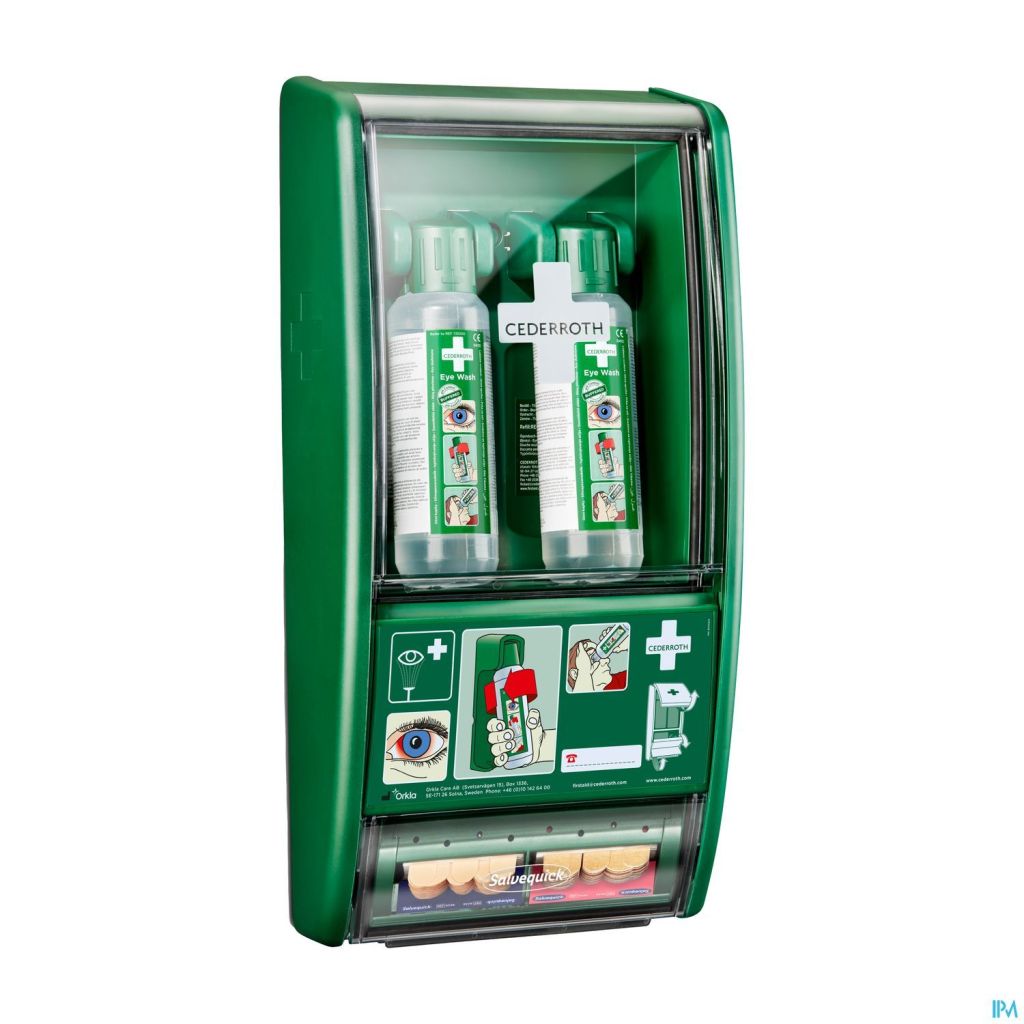 Cederroth oogdouchestation is ontworpen om snel hulp te kunnen bieden. Het station heeft plaats voor 2 flessen die automatisch worden geopend wanneer ze uit de houder worden gedraaid. De flessen zijn zo vormgegeven dat het oog gedurende ca. 1,5 minuut met een rijke stroom wordt gespoeld. 4,5 jaar houdbaarheidstermijn.