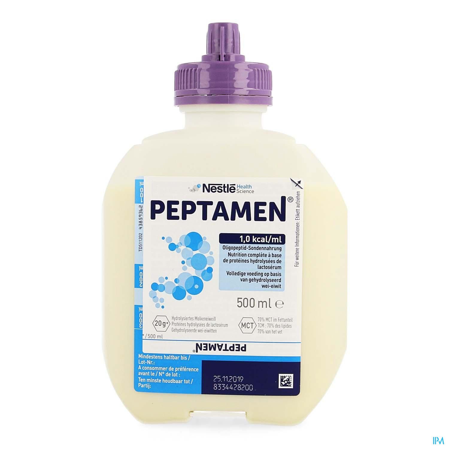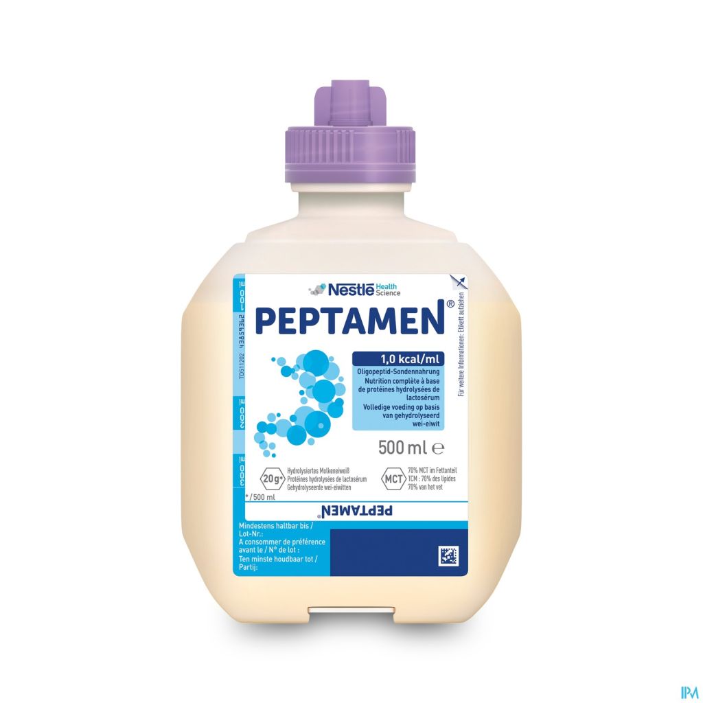 Peptamen is een voeding voor medisch gebruik. Volledige sondevoeding, rijk aan gehydrolyseerde wei-eiwitten (16% kcal) en bevat MCT (70% van het vet).