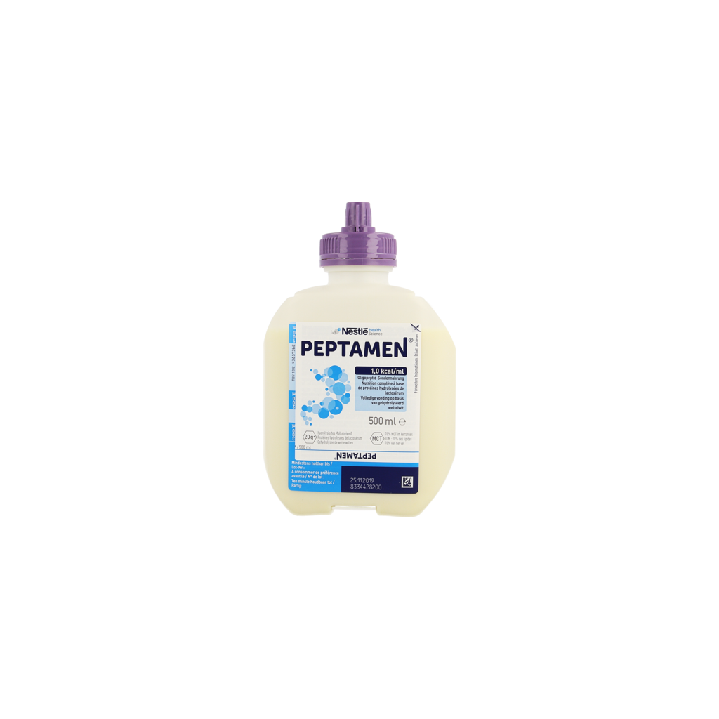 Peptamen® is een enterale volledige voeding, isocalorisch, normaal eiwitgehalte, op basis van gehydrolyseerd wei-eiwit, en 70% MCT (van totaal vet).