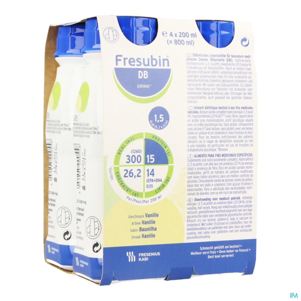 Fresubin DB DRINK is een volwaardige vervangvoeding, boordevol energie (1,5 kcal/ml) en hoogwaardige eiwitten, met voedingsvezels. Deze voeding voorziet het lichaam van de nodige energie, voor wanneer gewone voeding niet volstaat of extra voedingsstoffen nodig zijn. Deze formule is specifiek bedacht voor personen met een verstoorde bloedsuikerspiegel en bevat een hoog gehalte aan onverzadigde vetzuren. De voedingsvezels en trage koolhydraten in deze formule dragen bij aan een lage glycemische index. Het is een kant-en-klare voeding die geschikt is als enige voedingsbron.