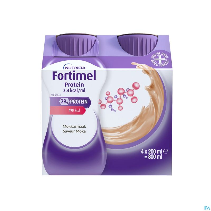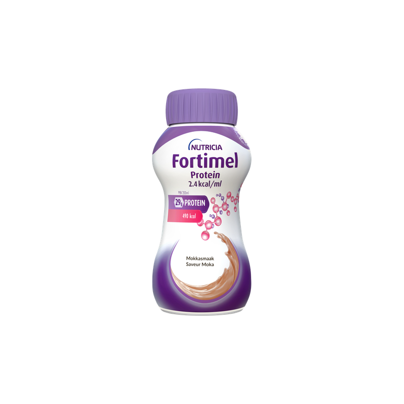 Voeding voor medisch gebruik. Dieetvoeding bij ziektegerelateerde ondervoeding. Fortimel Protein 2.4kcal 200 ml is een eiwitrijke en energierijke drinkvoeding. Glutenvrij.