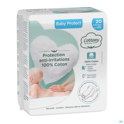 Cottony® Baby Protect 100% combineert een samenstelling van 100% zuiver katoen met een innovatieve en efficiënte technologie en voorkomt en verzacht irritaties, brandwonden en luieruitslag.