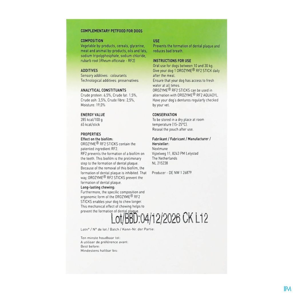 Orozyme RF2 Sticks helpen tandplak en slechte adem voorkomen. De sticks zijn plantaardig en bevatten het actieve ingrediënt RF2, een unieke actieve formule die de vorming van tandaanslag (biofilm) op de tanden aanduidend vermindert en een slechte adem van de hond aanpakt.