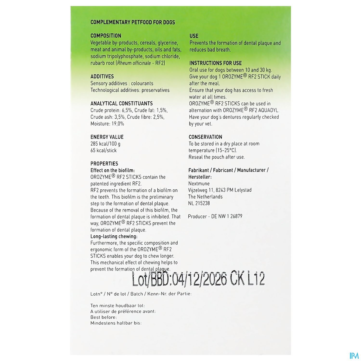 De samenstelling, de structuur en de vorm van de Orozyme RF2 Sticks zorgen voor een mechanisch schuureffect zodat de tanden tot op de tandvleeslijn gereinigd worden. De sticks bevatten een aanvaardbare hoeveelheid calorieën: Small 35 kcal, Medium 63 kcal en Large 90 kcal.