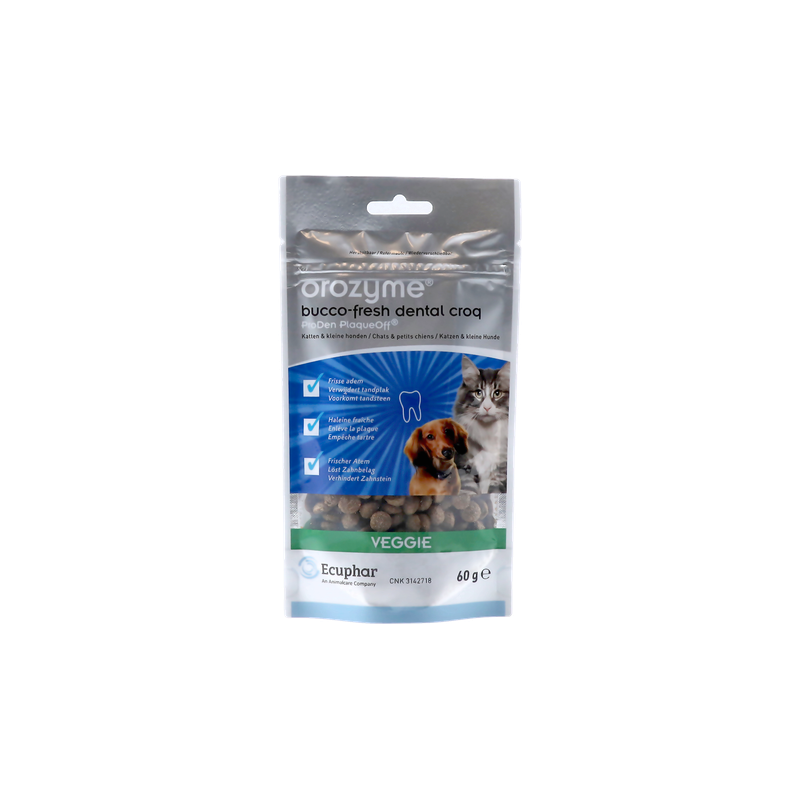 Orozyme Bucco Fresh Dental Croqs is een 100% natuurlijk aanvullend diervoeder op basis van een speciaal type algen. Deze algen zijn ook terug te vinden in . De Dental Croqs verhinderen dat tandplak zich vastzet op de tanden en verweekt de aanslag. Orozyme Bucco Fresh PlaqueOff