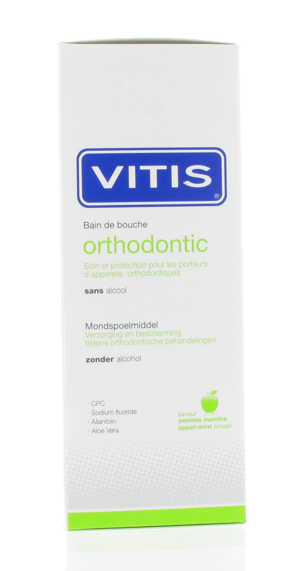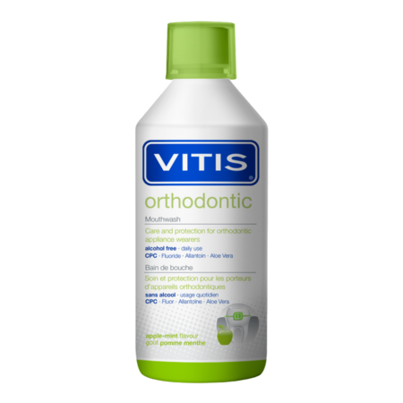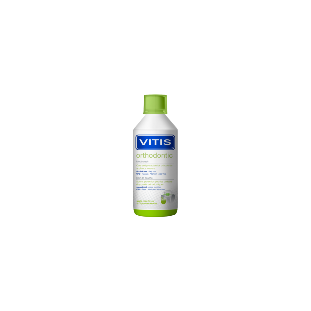 VITIS Orthodontic Mondspoeling is specifiek ontwikkeld om de mond en het gebit te beschermen tegen (cariës) gaatjes, tandvleesproblemen en irritatie aan tandvlees, wangen en tong door aanwezigheid van een beugel en brackets (slotjes). De mondspoeling met aangename appel-mint smaakt verzorgt en beschermt de zachte weefsels in de mond en helpt de apparatuur schoon te houden.