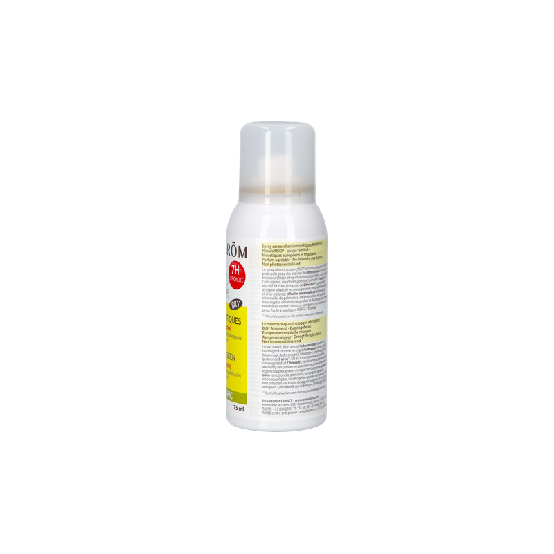 Deze aangenaam afstotende bodyspray beschermt de huid tegen de beten van Europese en tropische muggen (Aedes albopictus (tijgermug), Aedes aegypti, Culex pipiens, Anopheles gambiae) gedurende 7 uur ; dit natuurlijke afweermiddel is samengesteld uit een mengsel van essentiële oliën van citroengras, palmarosa, citroengras, geranium, citroeneucalyptus, kruidnagel, gember en Citriodiol dat bekend staat om zijn afstotende eigenschappen. Formule verrijkt met kokosolie-extracten, niet vettig, droogt de huid niet uit.