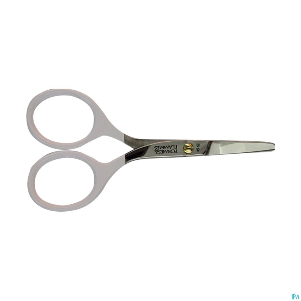 Babyschaartje uit roestvrij staal met witte handvaten. Ronde uiteinden voor een veilig gebruik.