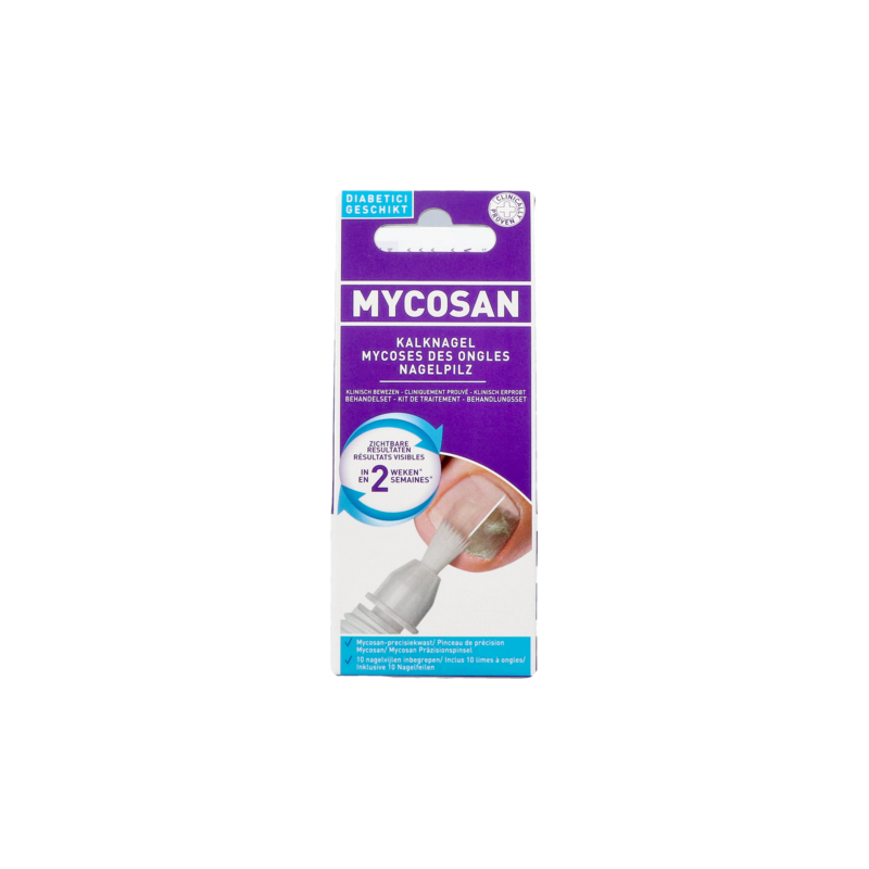 Mycosan Kalknagel Behandelset is bedoeld om een beschermlaagje op de nagel te vormen die de groei van de schimmels remt, die betrokken zijn bij schimmelinfecties aan vinger- en teennagels.