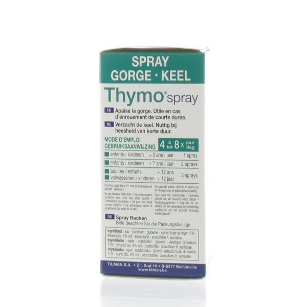 Dan is Thymospray het ideale middel voor u. Zijn formule op basis van tijm en zonder suiker verzacht snel de geïrriteerde en gezwollen keel.