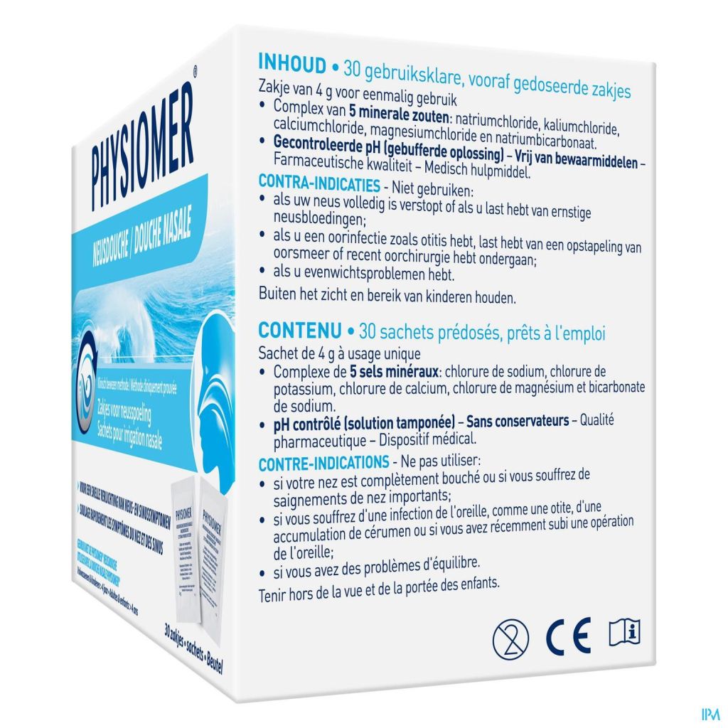 - Voer geen neusspoeling uit met bron- of mineraalwater* zonder toevoeging van 1 of 2 zakjes Physiomer® Sinusitis (naargelang de gewenste dosering). Water is alleen hypotonisch en kan neusverstopping veroorzaken.