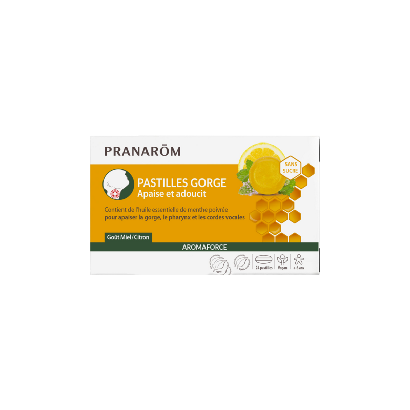 Zoetstoffen: isomalt, maltitolsiroop ; Emulgatoren : arabische gom, glycerine ; Essence van Citrus limon (citroen); Smaakstof : honing ; Essentiële oliën van Cinnamomum camphora (Ravintsara), Mentha piperita (Pepermunt), essentie van Citrus sinensis (zoete sinaasappel); Satureja montana (Winterbonenkruid) g, Cinnamomum Cassia (Chinese kaneel), Eugenia caryophullus (Kruidnagel) , Cymbopogon citratus (Lemongrass); Kleurstoen : Quinoleine Geel, Oranje Geel S.