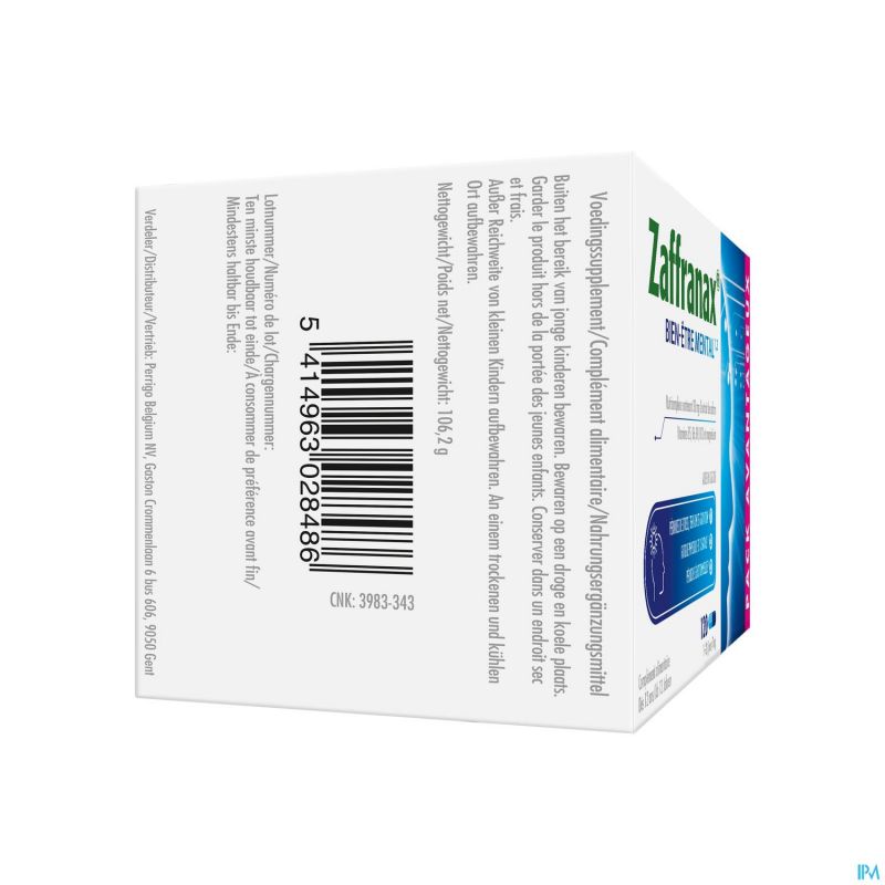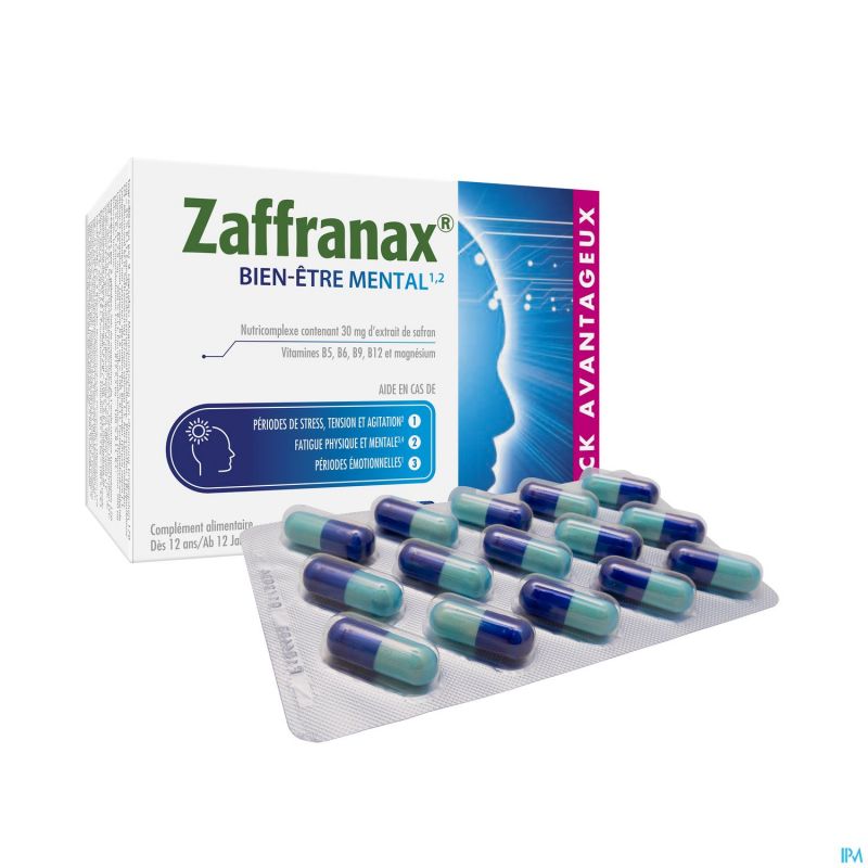 ¹ Zaffranax® bevat saffraan die het emotioneel evenwicht ondersteunt, helpt om te ontspannen en een positieve instelling te behouden. Het bevat magnesium dat bijdraagt aan de geestelijke veerkracht en helpt om vermoeidheid te verminderen, vitamine B5 die bijdraagt aan de normale mentale prestaties, inclusief stressbestendigheid en concentratie en de vitamines B6, B9, B12 die helpen om vermoeidheid te verminderen.