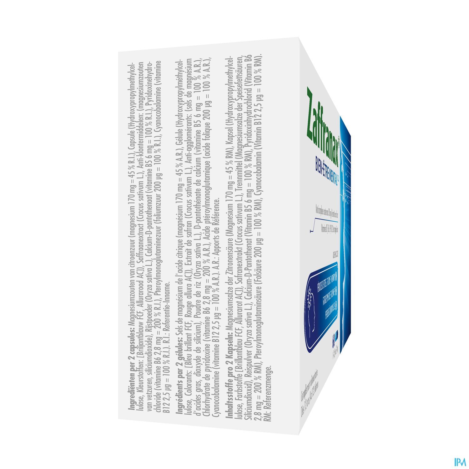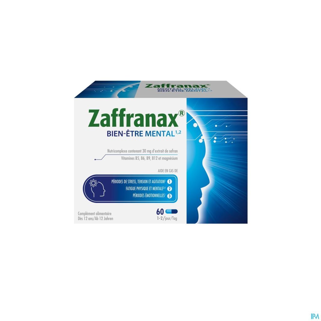 ¹ Zaffranax® bevat saffraan die het emotioneel evenwicht ondersteunt, helpt om te ontspannen en een positieve instelling te behouden. Het bevat magnesium dat bijdraagt aan de geestelijke veerkracht en helpt om vermoeidheid te verminderen, vitamine B5 die bijdraagt aan de normale mentale prestaties, inclusief stressbestendigheid en concentratie en de vitamines B6, B9, B12 die helpen om vermoeidheid te verminderen.