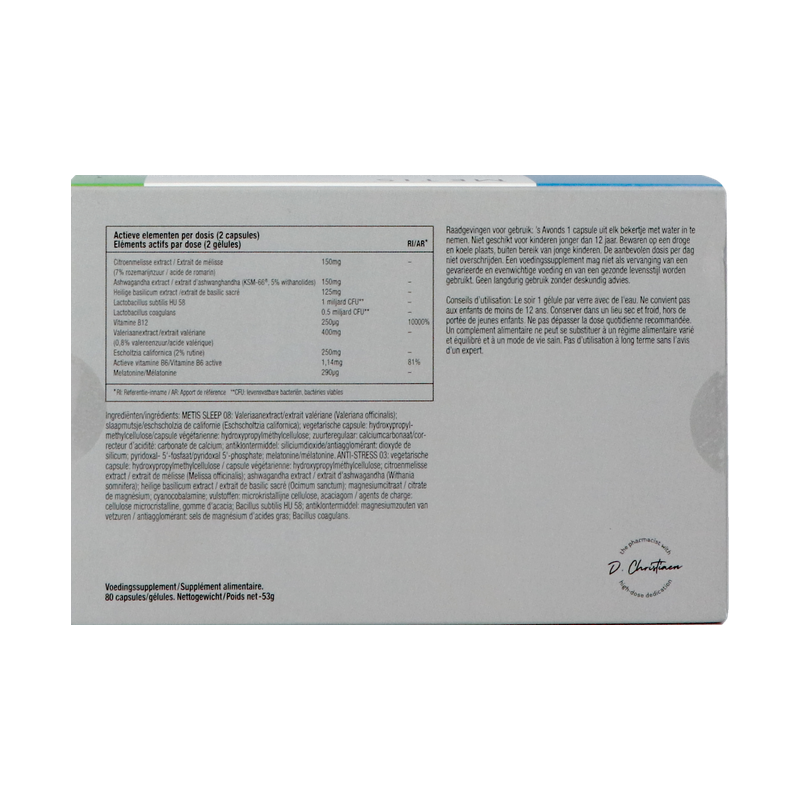 's Avonds 1 capsule Metis Sleep 08 + 1 tot 2 capsules Metis Anti-Stress 03 met een beetje water innemen, 30 min voor het slapengaan.