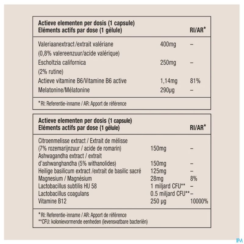 Ingrediënten: valeriaanextract: valeriana officinalis, eschscholzia, vitamine B6: Pyridoxal-5'-fosfaat, vegetarische capsule: hydroxypropylmethylcellulose, zuurteregelaar: calciumcarbonaat, anitklontermiddel: siliciumdioxide, melatonine