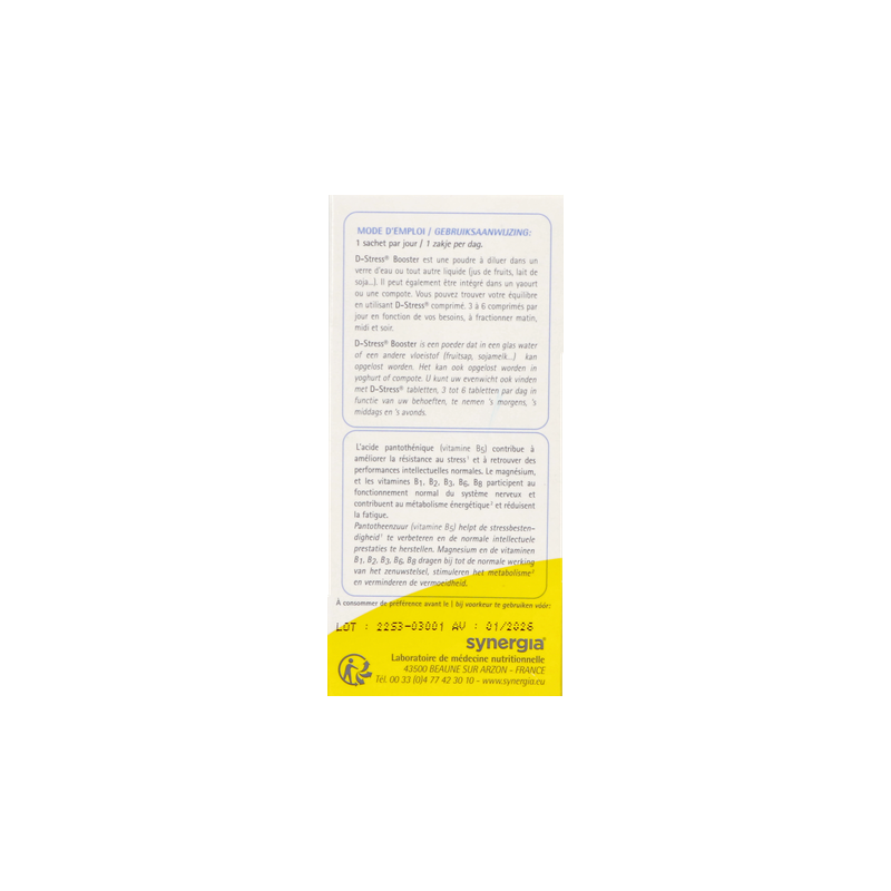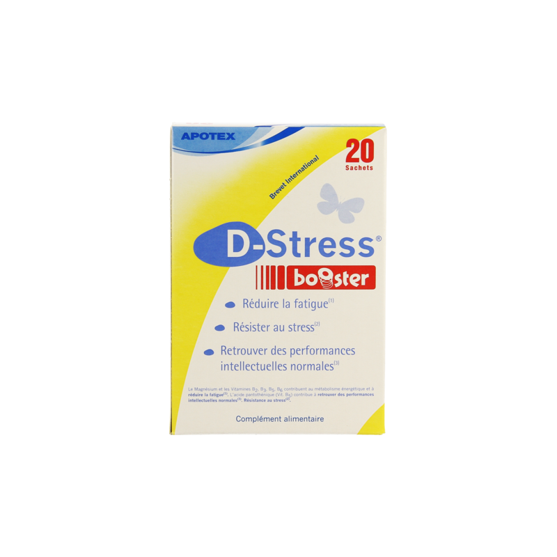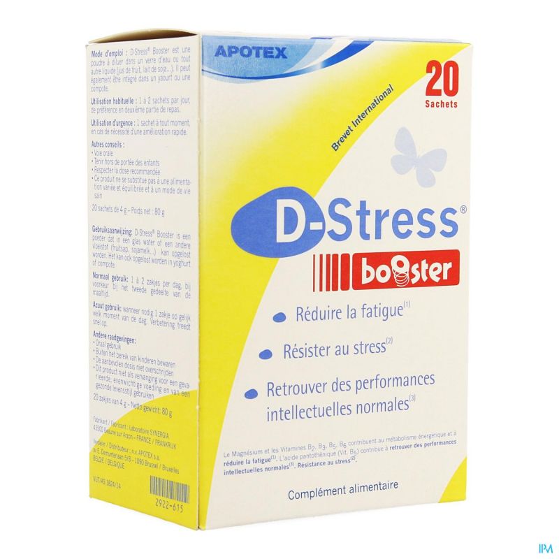Dit voedingssupplement draagt bij tot de verbetering van de weerstand tegen stress en tot het terugwinnen van de normale intellectuele prestaties. D-Stress® Booster is een poeder dat in een glas water of een andere vloeistof (fruitsap, sojamelk...) kan opgelost worden. Het kan ook opgelost worden in yoghurt of compote.