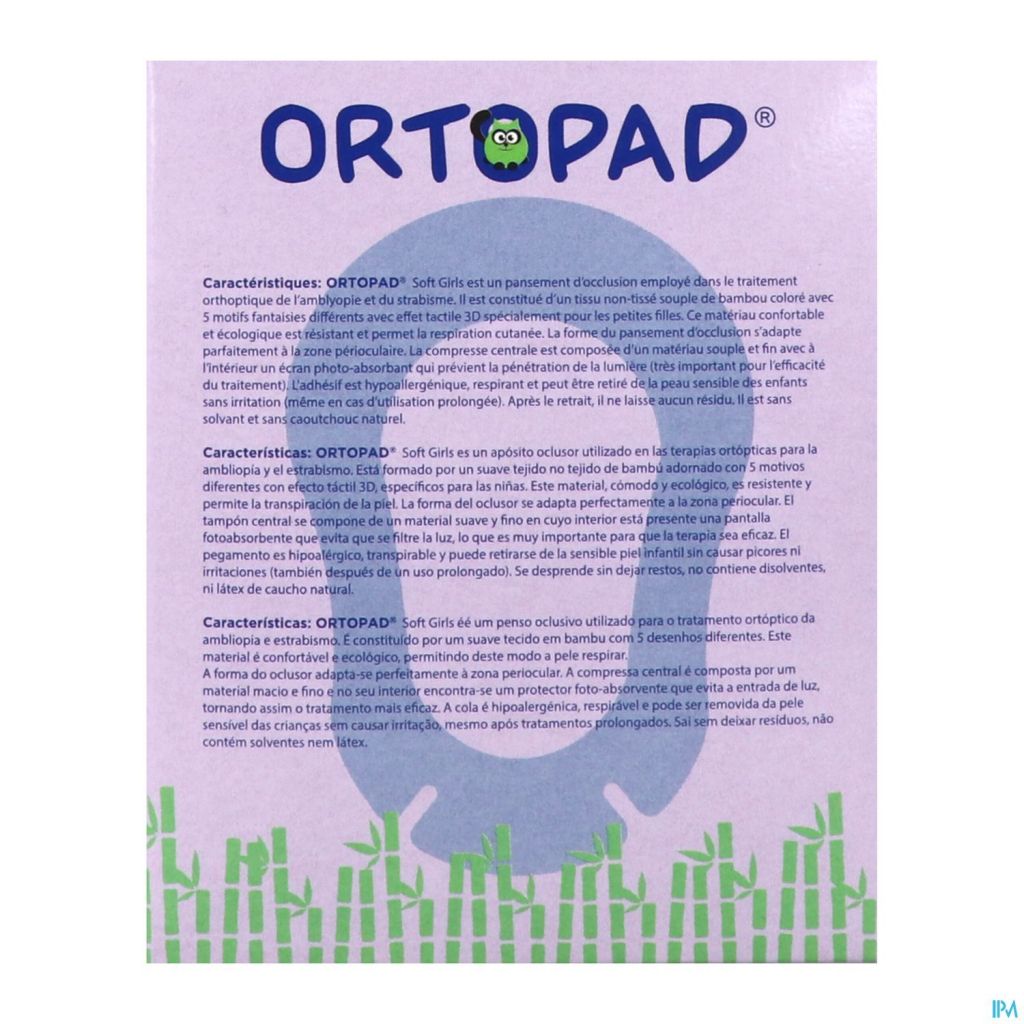 Oogpleister voor behandeling van lui oog. ORTOPAD® soft girls is vervaardigd van zacht katoenen vlies voor hoog draagcomfort. Lucht doorlatend en met hypoallergene hot melt-lijm. Zacht kussen met lichtdichte laag voor betrouwbare occlusie, ergonomische vorm met inkepingen aan de neus. Met donszachte reliëfdruk en 5 geheel nieuwe motieven voor meisjes.