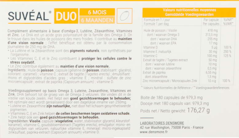EPAX visolie, Vitamine C (calciumascorbaat, ascorbinezuur), Luteïne geëxtraheerd uit Tagetes erecta, Vitamine E (D Alpha Tocopherol), Micro-ingekapseld zinksulfaat, emulgator: glycerylmonostearaat, Zeaxanthine geëxtraheerd uit Tagetes erecta (saffloer), Vitamine D3 (cholecalciferol). Omhulsel: visgelatine van schubben en vinnen, bevochtigingsmiddel: glycerol, kleurstoffen: rood ijzeroxide, geel ijzeroxide.