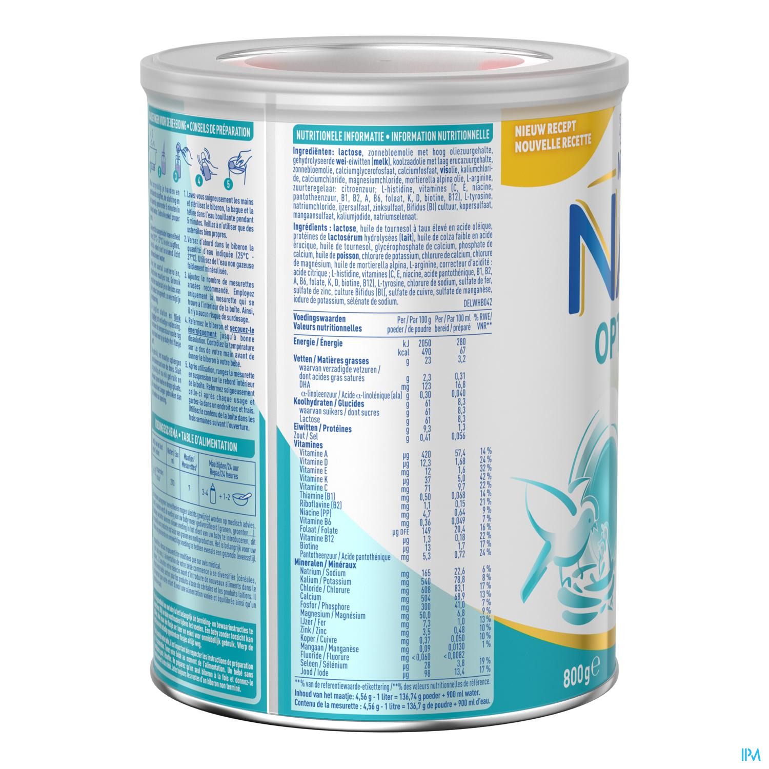 Lactose, zonnebloemeolie met hoog oliezuurgehalte, gehydrolyseerde wei-eiwitten (melk), koolzaadolie met laag erucazuurgehalte, zonnebloemolie, visolie, kaliumchloride, calciumglycerofosfaat, cholinebitartraat, calciumfosfaat, magnesiumchlo- ride, mortierella alpina olie, calciumchloride, L-arginine, zuurteregelaar: citroenzuur; L-histidine, natriumchloride, vitamines (C, E, niacine, pantotheenzuur, B1, B2, A, B6, foliumzuur, K, D, biotine, B12), L-tyrosine, taurine, inositol, L-carnitine, ijzersulfaat, zinksulfaat, nucleotiden, Bifidus (Bl) cultuur, kopersulfaat, kaliumjodide, natriumselenaat
