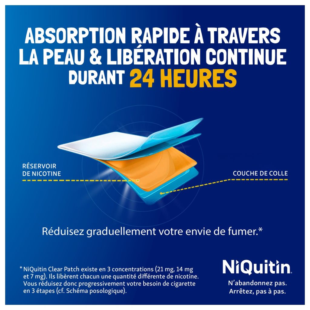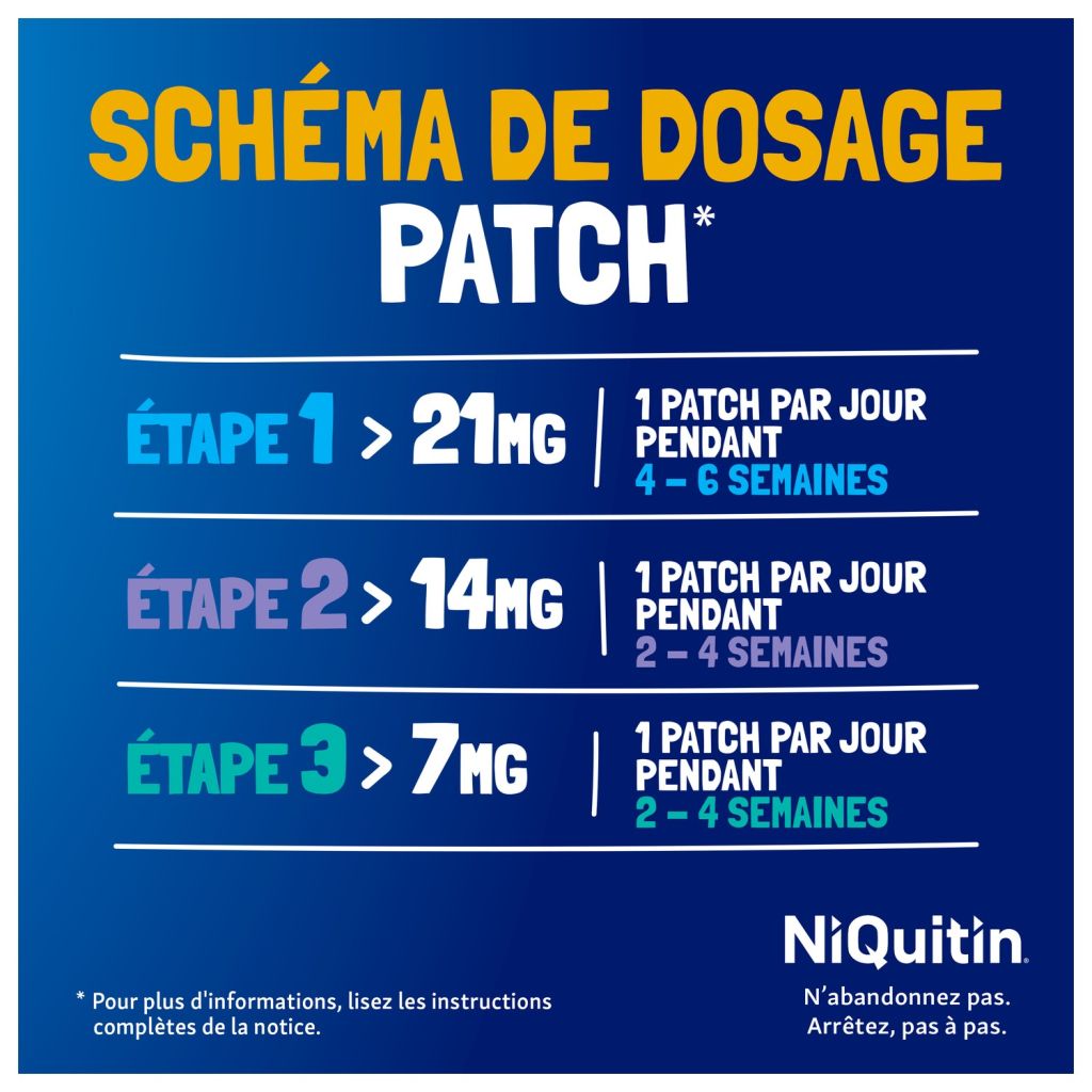 - 21 mg vormt de eerste stap in de rookstopbehandeling: NiQuitin® Clear Patch bestaat uit 3 sterktes (21 mg, 14 mg en 7 mg). Ze geven elk een verschillende hoeveelheid nicotine af. Je bouwt dus geleidelijk in 3 stappen je behoefte naar een sigaret af (cf. Doseringsschema).