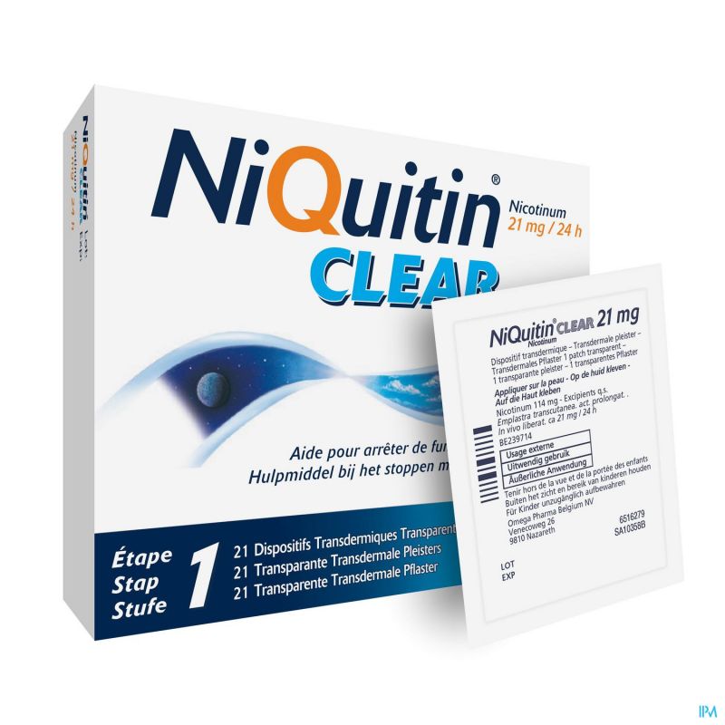 - 21 mg vormt de eerste stap in de rookstopbehandeling: NiQuitin® Clear Patch bestaat uit 3 sterktes (21 mg, 14 mg en 7 mg). Ze geven elk een verschillende hoeveelheid nicotine af. Je bouwt dus geleidelijk in 3 stappen je behoefte naar een sigaret af (cf. Doseringsschema).