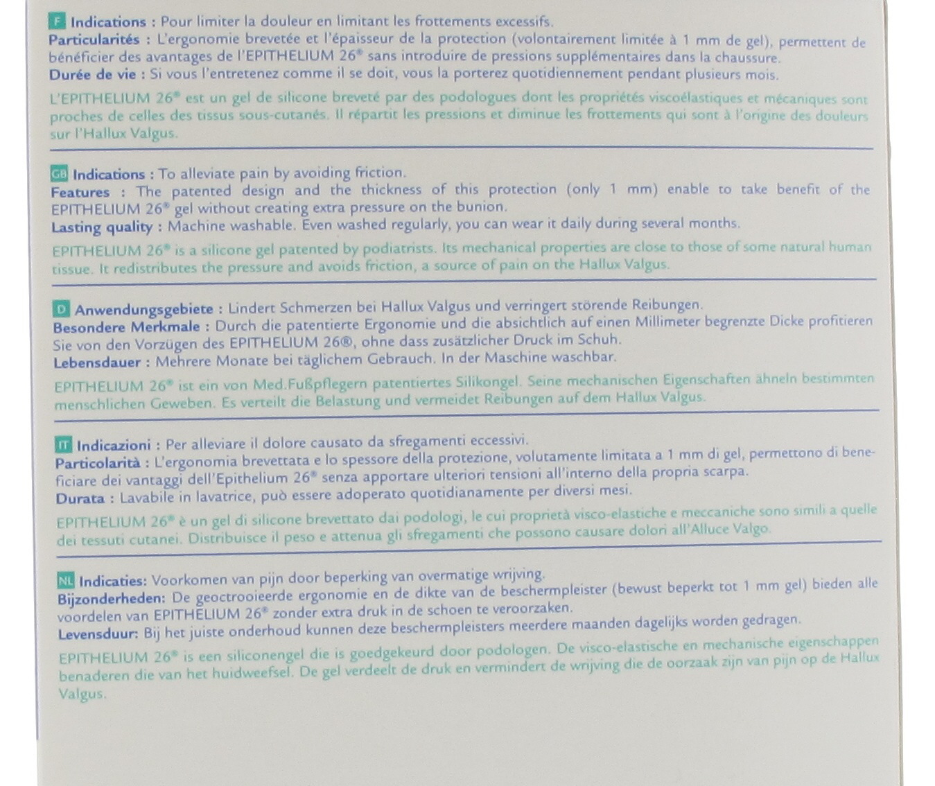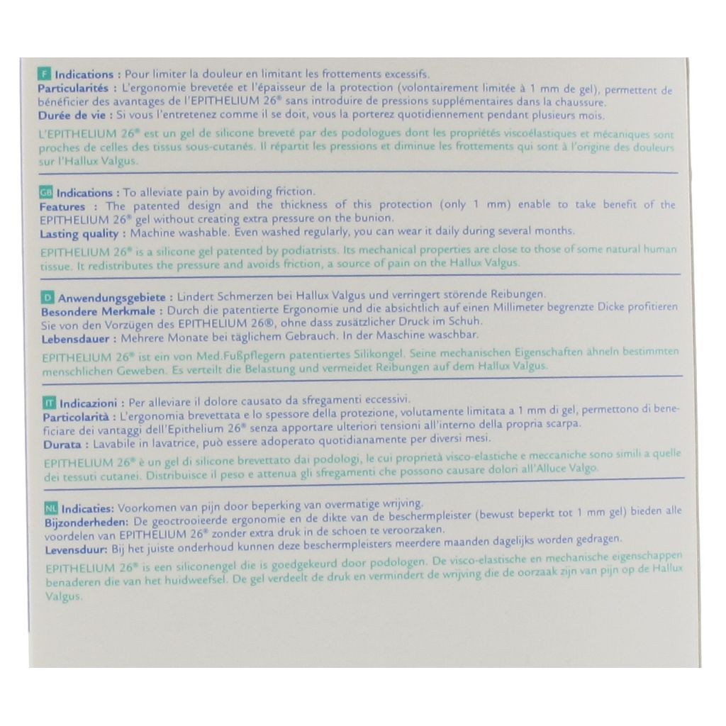 Het conflict met de schoen creëert pijn op de botuitstulping en door extreme druk en wrijvingen ontstaat er eelt. U moet dus tussen de schoen en de "knobbel" een interface plaatsen die de belasting kan verdelen en de pijn kan verlichten. Dit wordt gedaan door de siliconengel Epithelium 26® die in de hallux valgus beschermer EPITACT® geïntegreerd is.
