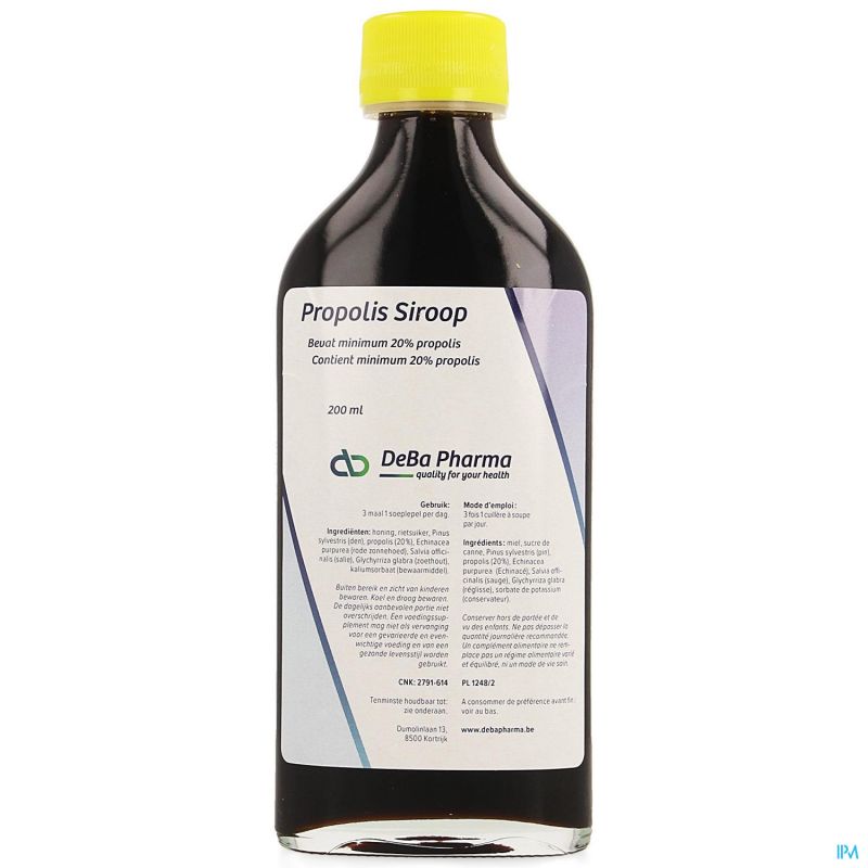 Propolis (20%), Pinus sylvestris (den), Echinacea purpurea (rode zonnehoed), Salvia officianalis (salie), Glychyrriza glabra (zoethout), Honing, Rietsuiker, Kaliumsorbaat (bewaarmiddel)