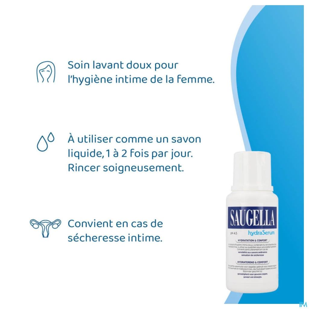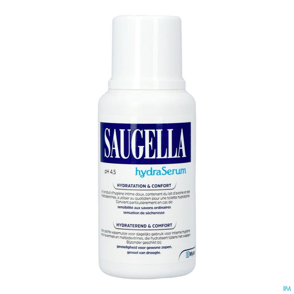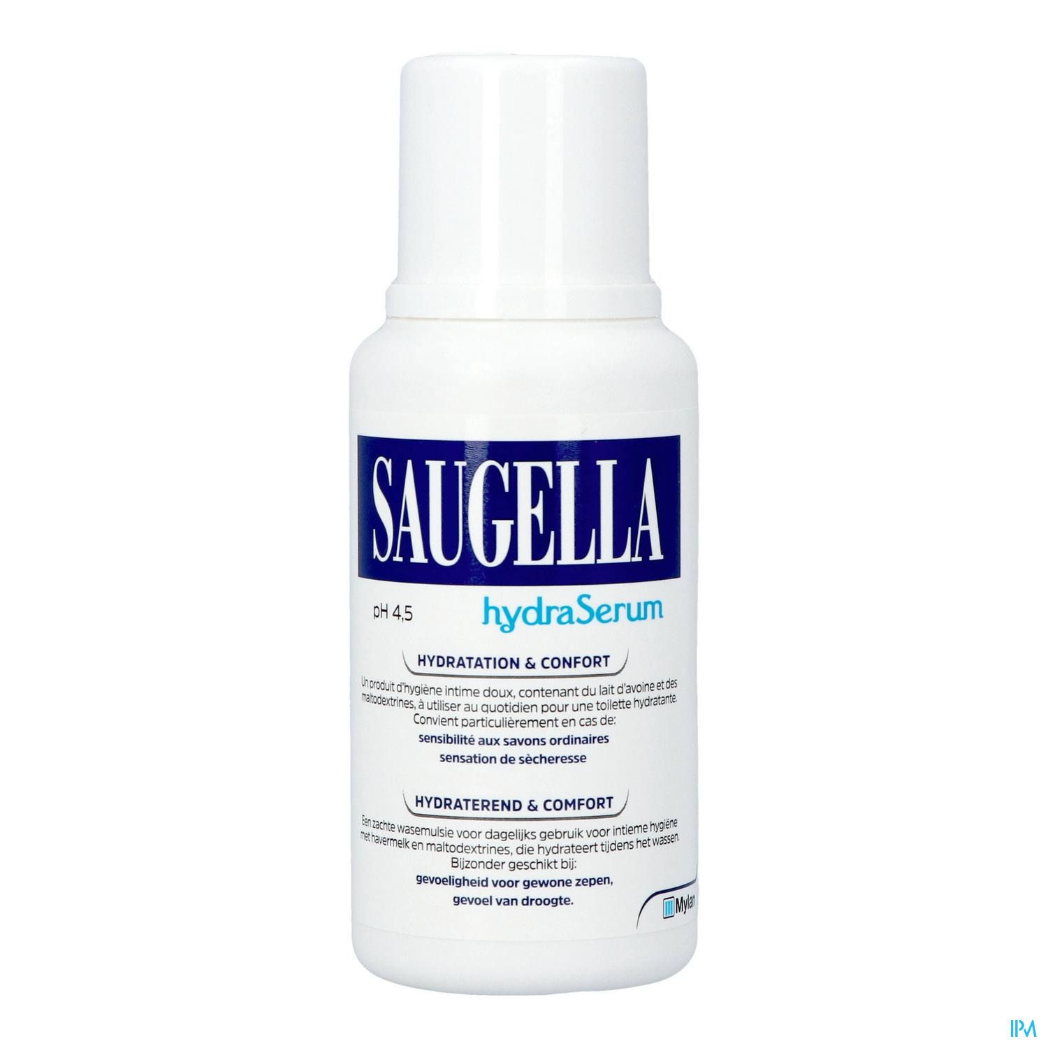 Saugella hydraSerum is een wasemulsie voor de dagelijkse intieme hygiëne met havermelk, maltodextrines, extract van Salvia officinalis (salie) en van Calendula officinalis (goudsbloem) die zowel een vochtinbrengende als een zacht reinigende werking heeft.