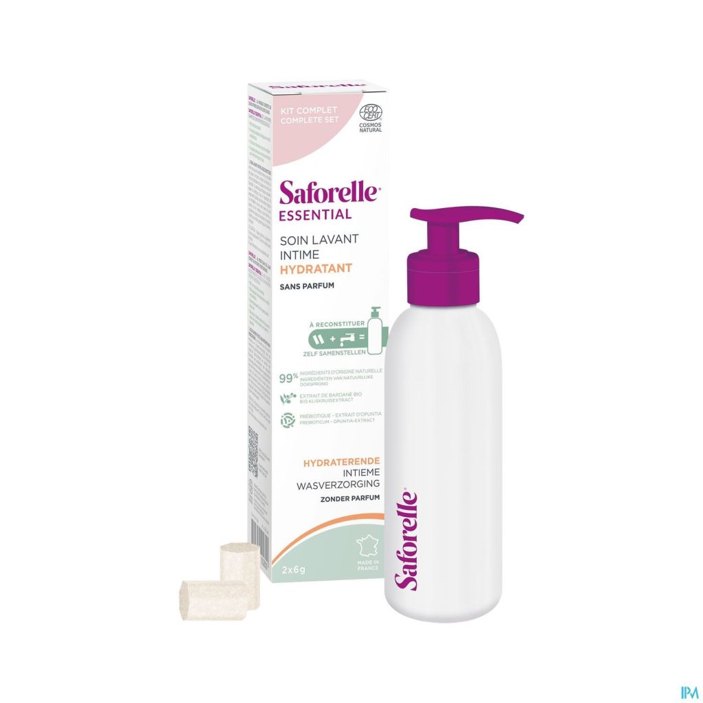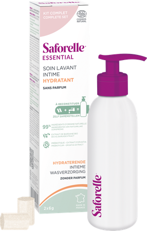 Saforelle ESSENTIAL is het 1ste assortiment zelf aan te maken intieme wasoplossingen. Dit ecologisch ontworpen product met 99% natuurlijke ingrediënten beschermt de intieme zone, verzacht ongemak en respecteert en behoudt de intieme flora op dagelijkse basis.