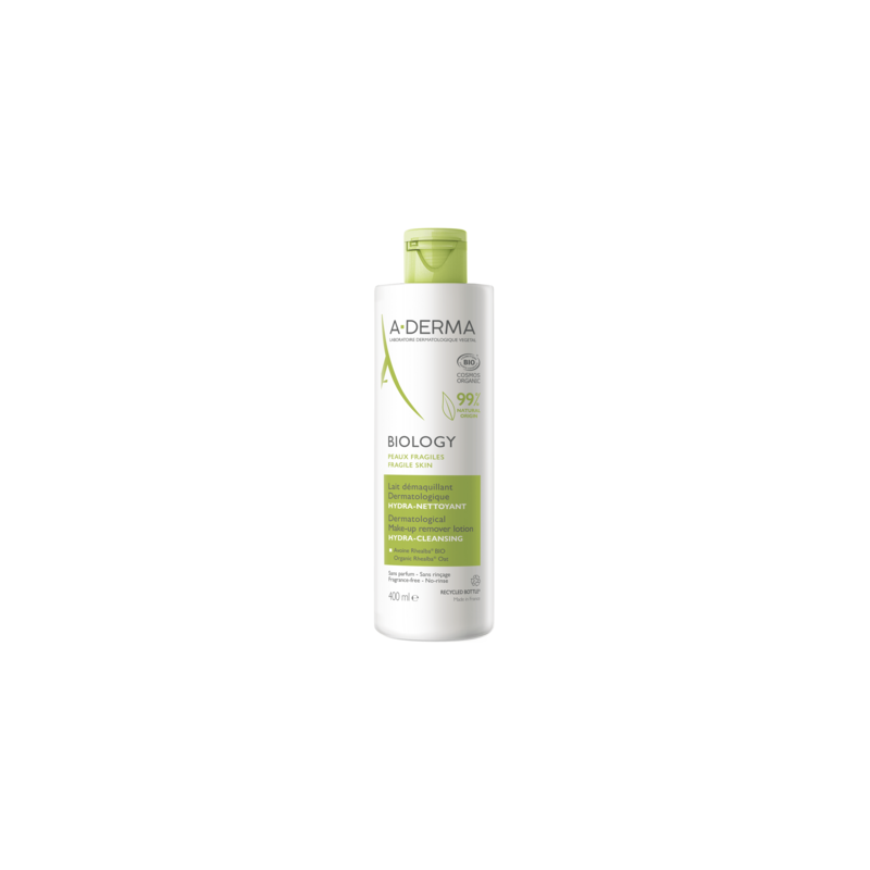 Met BIOLOGY HYDRATERENDE DERMATOLOGISCHE REINIGINGSMELK heeft A-DERMA de eerste dermatologische en BIO-gecertificeerde reinigingsmelk ontwikkeld die geschikt is voor alle kwetsbare gezichtshuidtypes. De innovatieve formule bevat het voornaamste actieve bestanddeel van de BIOLOGY-lijn, Rhealba® biologisch haversap* , dat bekend staat om zijn herstellende en hydraterende eigenschappen, evenals paardenbloemextract, bekend om zijn anti-vervuilingseigenschappen. Deze dermatologische REINIGINGSMILK, die melkachtig en niet-kleverig is, hoeft niet afgespoeld te worden en is getest op de allergische huid. Het is ontworpen voor gebruik op het gezicht en de oogcontour. Het verwijdert make-up en reinigt uiterst mild, terwijl het hydrateert en de kwetsbare huid in balans brengt. Het is niet geparfumeerd en bevat geen essentiële oliën, is niet-comedogeen, en heeft een formule van 99% natuurlijke oorsprong die gecertificeerd biologisch is. Met BIOLOGY DERMATOLOGISCHE REINIGINGSMELK biedt A-DERMA de kwetsbare huid een verzorgingsproduct dat alleen essentiële ingrediënten bevat om een optimale tolerantie te garanderen.Rhealba® Haver van biologische teelt. Vegan info: zonder ingrediënten van dierlijke oorsprong.