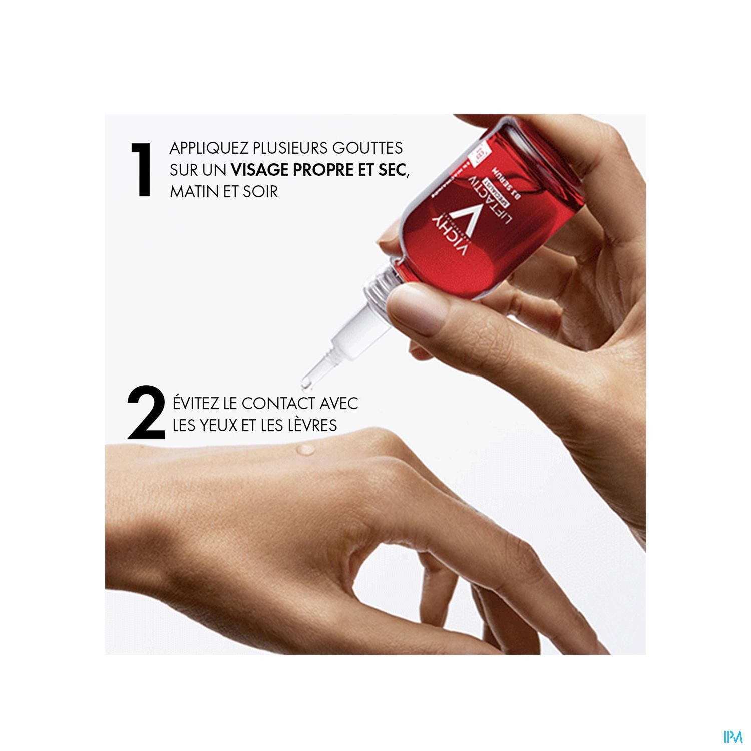 Breng 's morgens en 's avonds enkele druppels aan op een gereinigd en droog gezicht. Vermijd contact met de ogen en de lippen.