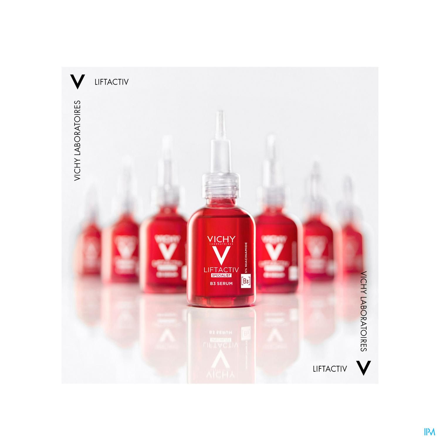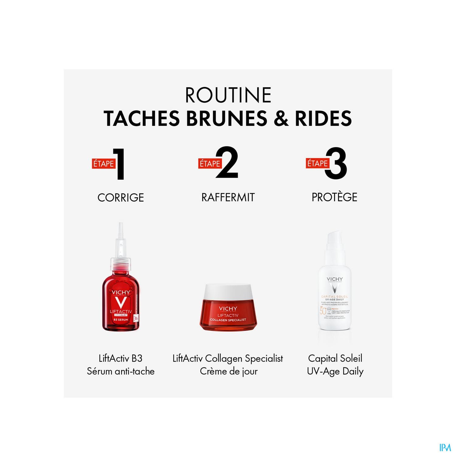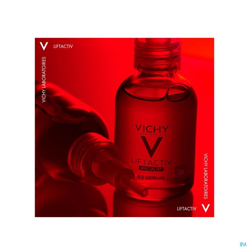 Liftactiv Specialist Serum B3 tegen pigmentvlekken en rimpels. Een hypoallergene formule met versterkend Vulkanisch Water van Vichy en een concentraat van ingrediënten: 4% Niacinamide, Tranexaminezuur & Vitamine Cg, om bruine vlekken, verkleuringen en rimpels te verminderen.