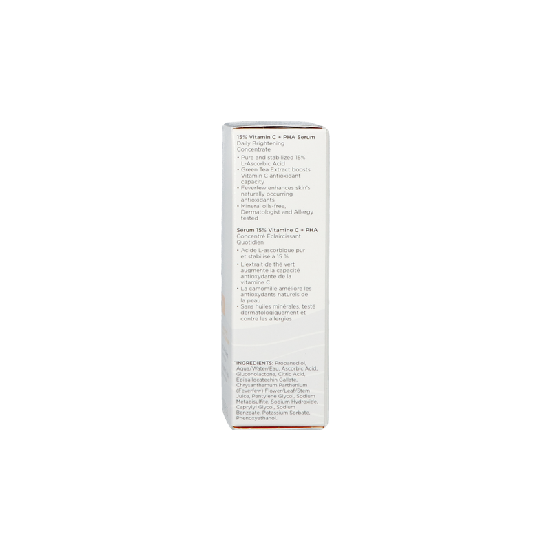 Het hoofdingrediënt van dit serum is 15% zuivere vitamine C (L-ascorbinezuur), een sterk ophelderend ingrediënt dat de huid veel effectiever opheldert dan vitamine C-derivaten. Bovendien bevat dit serum een polyhydroxyzuur (PHA) dat de huid zachtjes exfolieert, zodat vitamine C beter in de huid trekt.