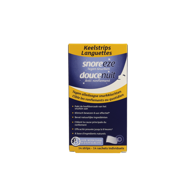 Snoreeze Keelstrips pakken de belangrijkste oorzaak van snurken aan. De dubbele werking verstevigt en smeert de zachte weefsels achter in de keel en helpt daarmee tot wel 8 uur tegen snurken. De Snoreeze Keelstrips hebben een frisse muntsmaak en lossen snel op voor een onmiddellijk effect.