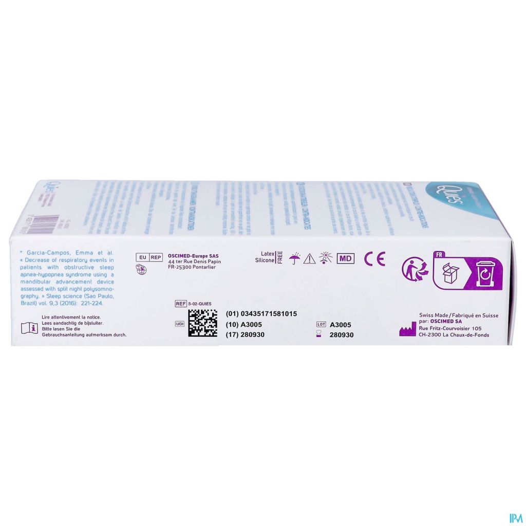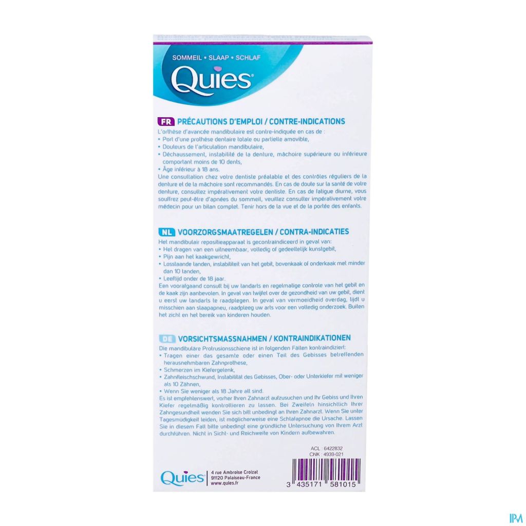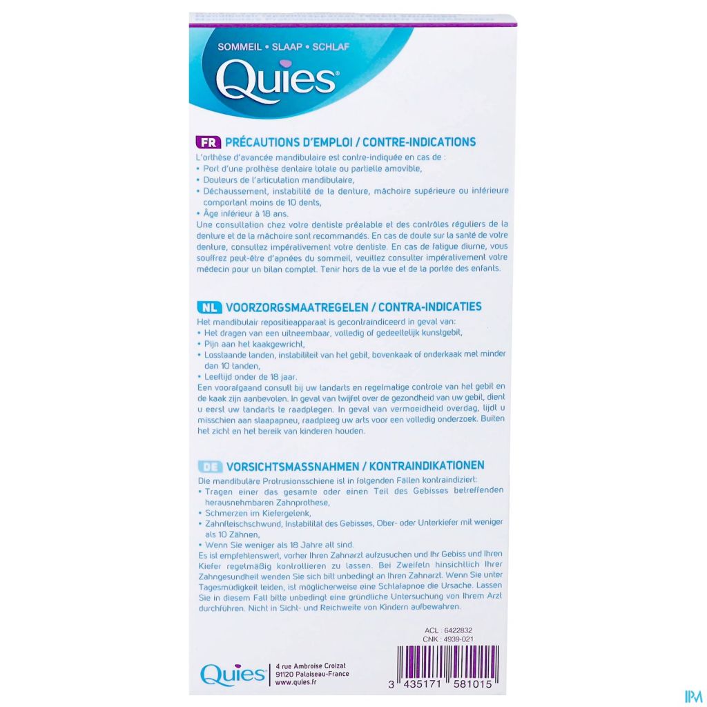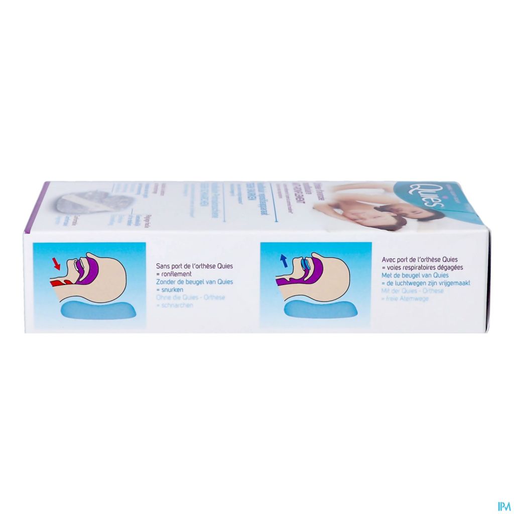 Het mandibulair repositieapparaat van Quies werkt tegen snurken en matige slaapapneu door de onderkaak iets naar voren te trekken (enkele milimeters) om de luchtdoorstroming te bevorderen. De thermovormbare beugels van het apparaat maken langdurig gebruik mogelijk. Deze medische hulpmiddelen zijn gereglementeerde gezondheidsproducten die in het kader van deze verordening van het CE-merkteken zijn voorzien.